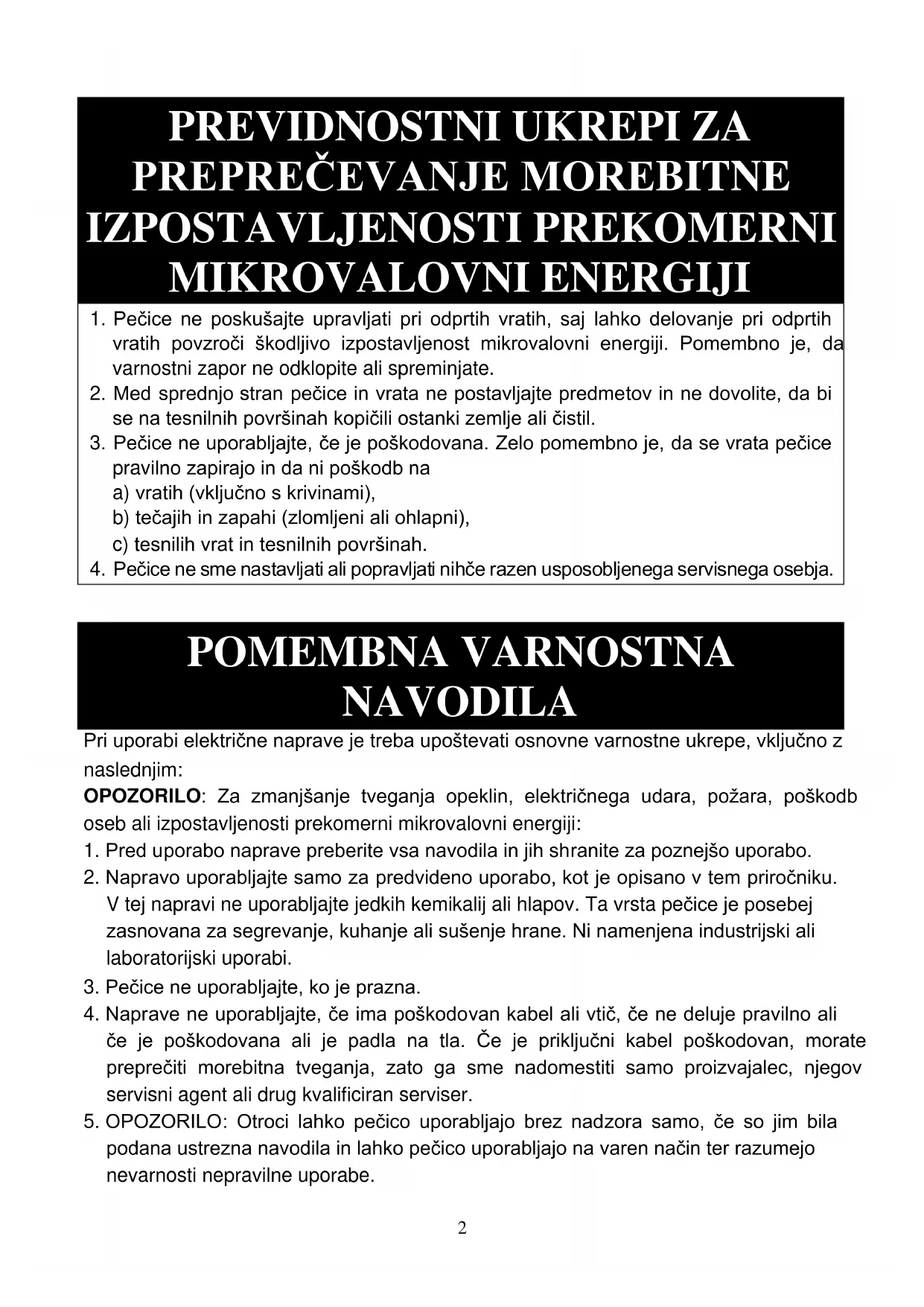 POMEMBNA VARNOSTNA NAVODILA Pri uporabi električne naprave je treba upoštevati osnovne varnostne ukrepe, vključno z naslednjim: OPOZORILO: Za zmanjšanje tveganja opeklin, električnega udara, požara, poškodb oseb ali izpostavljenosti prekomerni mikrovalovni energiji: