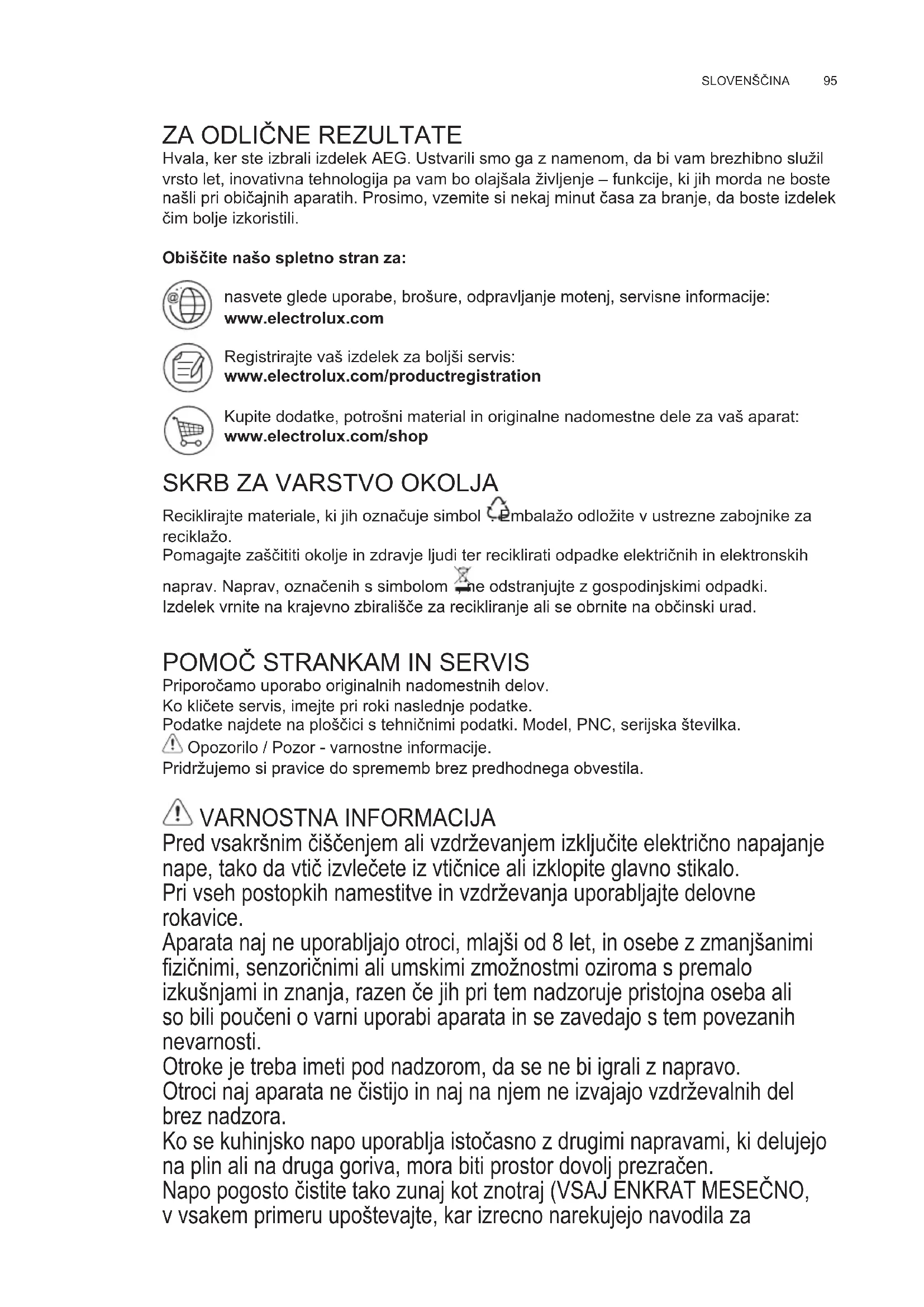 Priporočamo uporabo originalnih nadomestnih delov. Ko kličete servis, imejte pri roki naslednje podatke. Podatke najdete na ploščici s tehničnimi podatki. Model, PNC, serijska številka. Opozorilo / Pozor - varnostne informacije Pridržujemo si pravice do sprememb brez predhodnega obvestila. VARNOSTNA INFORMACIJA Pred vsakršnim čiščenjem ali vzdrževanjem izključite električno napajanje nape, tako da vtič izvlečete iz vtičnice ali izklopite glavno stikalo. Pri vseh postopkih namestitve in vzdrževanja uporabljajte delovne rokavice. Aparata naj ne uporabljajo otroci, mlajši od 8 let, in osebe z zmanjšanimi zičnimi, senzoričnimi ali umskimi zmožnostmi oziroma s premalo izkušnjami in znanja, razen če jih pri tem nadzoruje pristojna oseba ali so bili poučeni o varni uporabi aparata in se zavedajo s tem povezanih nevarnosti. Otroke je treba imeti pod nadzorom, da se ne bi igrali z napravo. Otroci naj aparata ne čistijo in naj na njem ne izvajajo vzdrževalnih del brez nadzora. Ko se kuhinjsko napo uporablja istočasno z drugimi napravami, ki delujejo na plin ali na druga goriva, mora biti prostor dovolj prezračen. Napo pogosto čistite tako zunaj kot znotraj (VSAJ ENKRAT MESEČNO, v vsakem primeru upoštevajte, kar izrecno narekujejo navodila za SL NAVODILO ZA UPORABOwww.electrolux.com