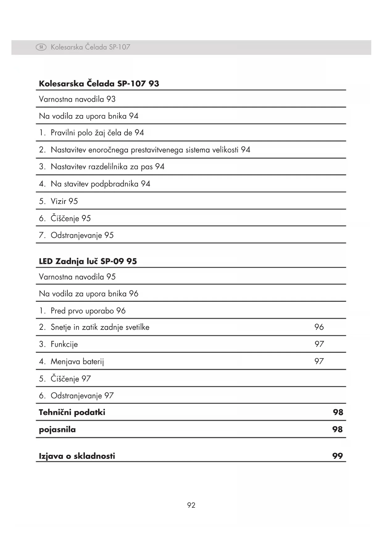 Porabljeni baterij ne odstranjujte kot gospodinjske odpadke, temveč v za ta namen predvidenih zbirnih posodah. Odpadnih naprav ni dovoljeno odlagati med gospodinjske odpadke! Ko izdelka ni več mogoče uporabljati, ima vsak potrošnik zakonsko dolžnost, da odpadne naprave odda ločeno od gospodinjskih odpadkov, npr. na zbirno mesto v svoji občini/mestni četrti. S tem bo zagotovljeno, da bodo stari izdelki strokovno reciklirani in bodo preprečeni negativni vplivi na okolje. Zato so električne naprave označene s tukaj prikazanim simbolom. Baterij in akumulatorjev ne odlagajte med gospodinjske odpadke! Kot potrošnik ste po zakonu dolžni vse baterije in akumulatorje, ne glede na to, ali vsebujejo škodljive snovi* ali ne, oddati na zbirnem mestu v svoji občini/mestni četrti ali v trgovini, da bodo odstranjene na okolju prijazen način. Baterije in akumulatorji, ki niso trdno nameščeni v napravi, jih je treba pred odlaganjem98 odstraniti in ločeno odstraniti. Baterije in akumulatorje odstranite le, ko so izpraznjeni! *označeno s: Cd = kadmij, Hg = živo srebro, Pb = svinec Tehnični podatki LED zadnja luč Model: SP-09 Baterija: 1x CR1620, 3V Razred zaščite: III Skupina tveganja: Prosta skupina (svetilka ne predstavlja foto-biološke nevarnosti) pojasnila Izjava o skladnosti (glej poglavje „Izjava o skladnosti“): Izdelki, označeni s tem simbolom, so v skladu z vsemi veljavnimi predpisi Skupnosti v Evropskem gospodarskem prostoru. razred zaščite III. LED lučka se napaja z nizko napetostjo preko baterije Datum poteka teža čelada Datum izdelave Certicirano varnostno tesnilo (oznaka GS) potrjuje, da izdelek izpolnjuje zahteve nemškega zakona o varnosti izdelkov (ProdSG). Oznaka GS pomeni, da nameravana uporaba in predvidljiva zloraba označenega izdelka ne bosta ogrozila varnosti in zdravja uporabnika. Preberite navodila za uporabo Enosmerna napetost LED Zadnja luč SP-0999 LED Zadnja luč SP-09 Izjava o skladnosti Izjavo EU o skladnosti lahko zahtevate z naslednjega naslova: SPEQ GmbH Tannbachstraße 10 73635 Steinenberg GERMANY Inštitut za testiranje TÜV Rheinland LGA Products GmbH Tillystrasse 2 90431 Nürnberg Nemčija identikacijska številka: 0197 PSA 2016/425 Celotna izjava o skladnosti je na voljo na spletni strani www.speq.de/konformitaetserklaerung.8 Service Address: SPEQ GmbH Tannbachstraße 10 D-73635 Steinenberg Hotline 00800 30 777 999 e-mail: service@speq.de web: www.speq.de Stand der Information ∙ Version des informations ∙ Informazioni aggiornate al: 12/2021 Testhaus: TÜV Rheinland LGA Products GmbH Tillystrasse 2 D-90431 Nürnberg Kenn-Nr. 0197 PSA-Verordnung 2016/425