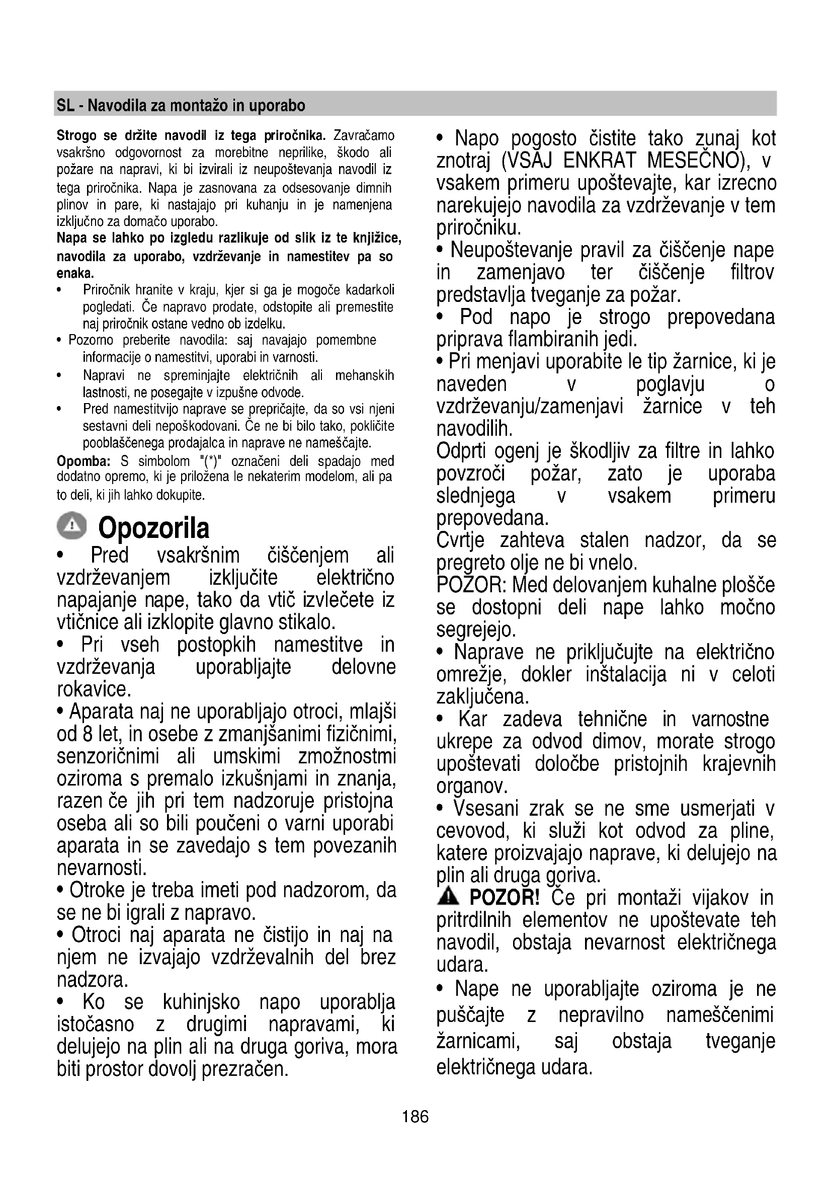 - Neupoštevanje pravil za čiščenje nape in zamenjavo ter čiščenje filtrov predstavlja tveganje za požar.