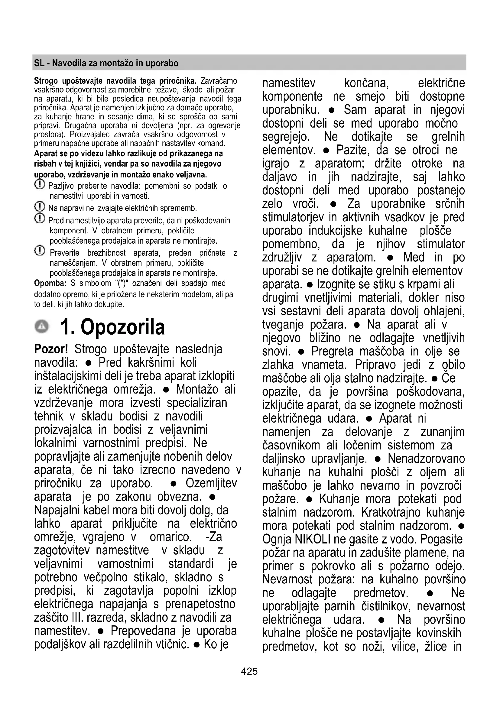 Pozor! Strogo upoštevajte naslednja navodila: ● Pred kakršnimi koli inštalacijskimi deli je treba aparat izklopiti iz električnega omrežja. ● Montažo ali vzdrževanje mora izvesti specializiran tehnik v skladu bodisi z navodili proizvajalca in bodisi z veljavnimi lokalnimi varnostnimi predpisi. Ne popravljajte ali zamenjujte nobenih delov aparata, če ni tako izrecno navedeno v priročniku za uporabo. ● Ozemljitev aparata je po zakonu obvezna. ● Napajalni kabel mora biti dovolj dolg, da lahko aparat priključite na električno omrežje, vgrajeno v omarico. -Za zagotovitev namestitve v skladu z veljavnimi varnostnimi standardi je potrebno večpolno stikalo, skladno s predpisi, ki zagotavlja popolni izklop električnega napajanja s prenapetostno zaščito III. razreda, skladno z navodili za namestitev. ● Prepovedana je uporaba podaljškov ali razdelilnih vtičnic. ● Ko je namestitev končana, električne komponente ne smejo biti dostopne uporabniku. ● Sam aparat in njegovi dostopni deli se med uporabo močno segrejejo. Ne dotikajte se grelnih elementov. ● Pazite, da se otroci ne igrajo z aparatom; držite otroke na daljavo in jih nadzirajte, saj lahko dostopni deli med uporabo postanejo zelo vroči. ● Za uporabnike srčnih stimulatorjev in aktivnih vsadkov je pred uporabo indukcijske kuhalne plošče pomembno, da je njihov stimulator združljiv z aparatom. ● Med in po uporabi se ne dotikajte grelnih elementov aparata. ● Izognite se stiku s krpami ali drugimi vnetljivimi materiali, dokler niso vsi sestavni deli aparata dovolj ohlajeni, tveganje požara. ● Na aparat ali v njegovo bližino ne odlagajte vnetljivih snovi. ● Pregreta maščoba in olje se zlahka vnameta. Pripravo jedi z obilo maščobe ali olja stalno nadzirajte. ● Če opazite, da je površina poškodovana, izključite aparat, da se izognete možnosti električnega udara. ● Aparat ni namenjen za delovanje z zunanjim časovnikom ali ločenim sistemom za daljinsko upravljanje. ● Nenadzorovano kuhanje na kuhalni plošči z oljem ali maščobo je lahko nevarno in povzroči požare. ● Kuhanje mora potekati pod stalnim nadzorom. Kratkotrajno kuhanje mora potekati pod stalnim nadzorom. ● Ognja NIKOLI ne gasite z vodo. Pogasite požar na aparatu in zadušite plamene, na primer s pokrovko ali s požarno odejo. Nevarnost požara: na kuhalno površino ne odlagajte predmetov. ● Ne uporabljajte parnih čistilnikov, nevarnost električnega udara. ● Na površino kuhalne plošče ne postavljajte kovinskih predmetov, kot so noži, vilice, žlice in426 pokrovi, ker bi se lahko pregreli. ● Preden aparat priključite v električno omrežje: preverite podatkovno tablico (nameščeno na dnu aparata) in se prepričajte, da napetost in moč ustrezata napetosti omrežja in da je priključna vtičnica primerna. V primeru dvomov se posvetujte s kvalificiranim električarjem. Pomembno: ● Po uporabi izključite kuhalno ploščo s pomočjo svoje krmilne naprave in ne zanašajte se na detektor posod. ● Izogibajte se razlitju tekočine, zato pri vretju ali segrevanju tekočine, zmanjšajte dovod toplote. ● Grelne elemente ne puščajte vklopljene in s prazno posodo ali brez nje na kuhališču. ● Ko končate s kuhanjem, izklopite odgovarjajoče kuhališče. ● Nikoli ne uporabljajte aluminijaste folije za kuhanje, in nikoli ne postavljajte izdelkov, pakiranih z aluminijem. Aluminij se lahko stali in nepopravljivo poškoduje vaš aparat. ● Nikoli ne segrevajte pločevink ali konzerv s hrano, ne da bi jih pred tem odprli, saj jih lahko raznese! To opozorilo velja tudi za vse druge vrste kuhalnih plošč. ● Uporaba visoke stopnje moči, kakršna je funkcija "Booster", ni primerna za segrevanje nekaterih tekočin, kot je na primer olje za cvrtje. Prevelika toplota je lahko nevarna. V teh primerih je priporočljivo uporabiti nižjo energetsko stopnjo. ● posode morajo biti nameščene neposredno na kuhalno ploščo in morajo biti v središču. V nobenem primeru med lonec in kuhalno ploščo ne vstavljajte drugih predmetov. ● Če je temperatura previsoka, aparat samodejno zniža stopnjo moči kuhališč. ● Pred vsakim postopkom čiščenja ali vzdrževanja aparat izklopite iz električnega omrežja tako, da izvlečete vtič ali odklopite z glavnim stikalom stanovanja. ● Pri vseh postopkih montaže in vzdrževanja nosite delovne rokavice. ● Aparat lahko uporabljajo otroci, starejši od 8 let, in osebe z zmanjšanimi fizičnimi, senzoričnimi ali duševnimi sposobnostmi ali s pomanjkanjem izkušenj ali potrebnega znanja, pod pogojem, da jih nekdo nadzoruje, ali po tem, ko prejmejo navodila bodisi glede varne uporabe aparata bodisi razumevanja nevarnosti, ki jim pretijo. ● Otroke je potrebno nadzorovati in zagotoviti, da se z aparatom ne igrajo. ● Otroci ne smejo čistiti in vzdrževati aparata, če niso pod nadzorom. ● Prostor mora imeti zadostno prezračevanje, kadar aparat uporabljate sočasno z drugimi aparati, ki za zgorevanje uporabljajo plin ali druga goriva. ● Aparat je treba pogosto čistiti, tako notranjost kot tudi zunanjost (VSAJ ENKRAT MESEČNO), v vsakem primeru pa upoštevajte, kar je izrecno navedeno v navodilih za vzdrževanje. ● Neupoštevanje pravil za čiščenje aparata in zamenjavo ter čiščenje filtrov pomeni tveganje za požar. ● Kuhanje s flambiranjem je strogo prepovedano. ● Uporaba prostega plamena je škodljiva za filtre in lahko povzroči požar, zato se je v vsakem primeru temu treba izogniti. ● Cvrtje je potrebno nadzirati, da se prepreči vnetje pregretega olja. ● POZOR: Med delovanjem kuhališča se dostopni deli aparata lahko segrejejo. ● Pozor! Aparata ne priključujte na električno omrežje, dokler namestitev ni popolnoma končana. ● Kar zadeva tehnične in varnostne ukrepe, ki jih je treba sprejeti za odvajanje hlapov, dosledno upoštevajte določbe predpisov pristojnih lokalnih organov. ● Vsesanega zraka se ne sme odvajati v vod, ki se up