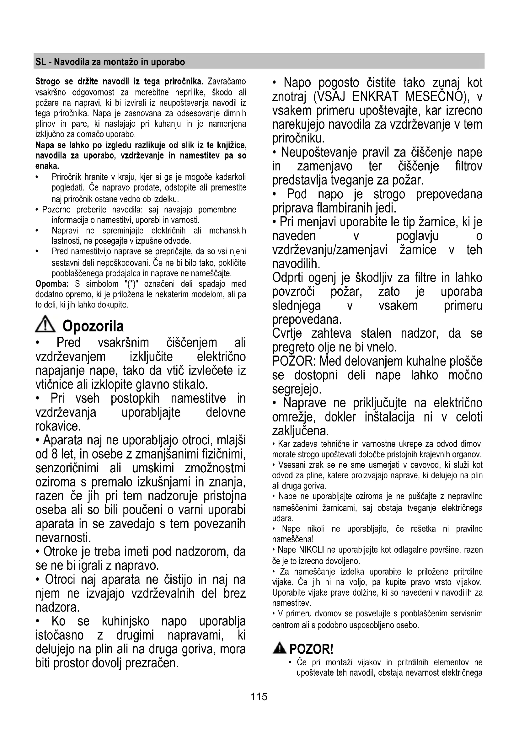- Neupoštevanje pravil za čiščenje nape in zamenjavo ter čiščenje filtrov predstavlja tveganje za požar.