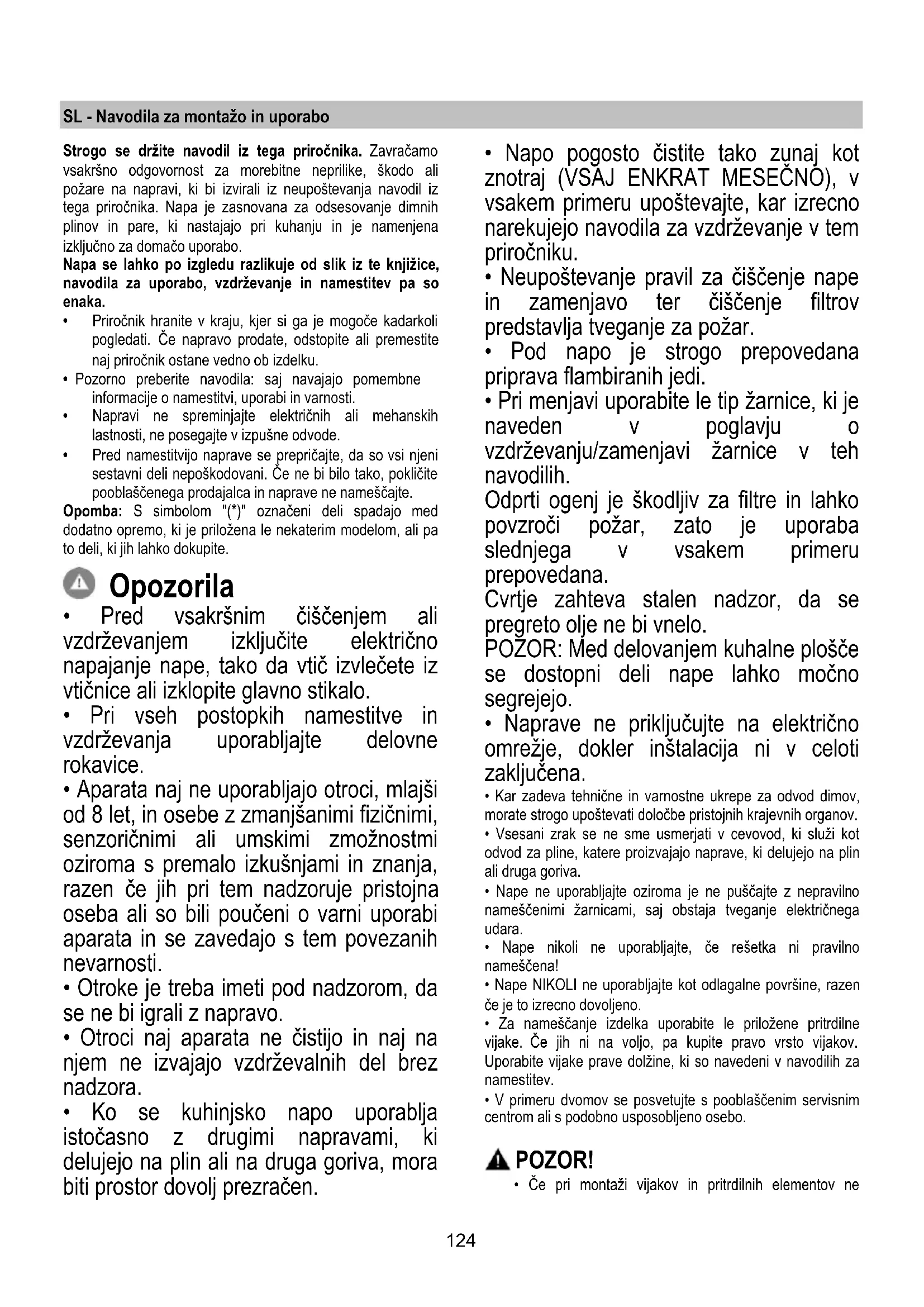 - Neupoštevanje pravil za čiščenje nape in zamenjavo ter čiščenje filtrov predstavlja tveganje za požar.