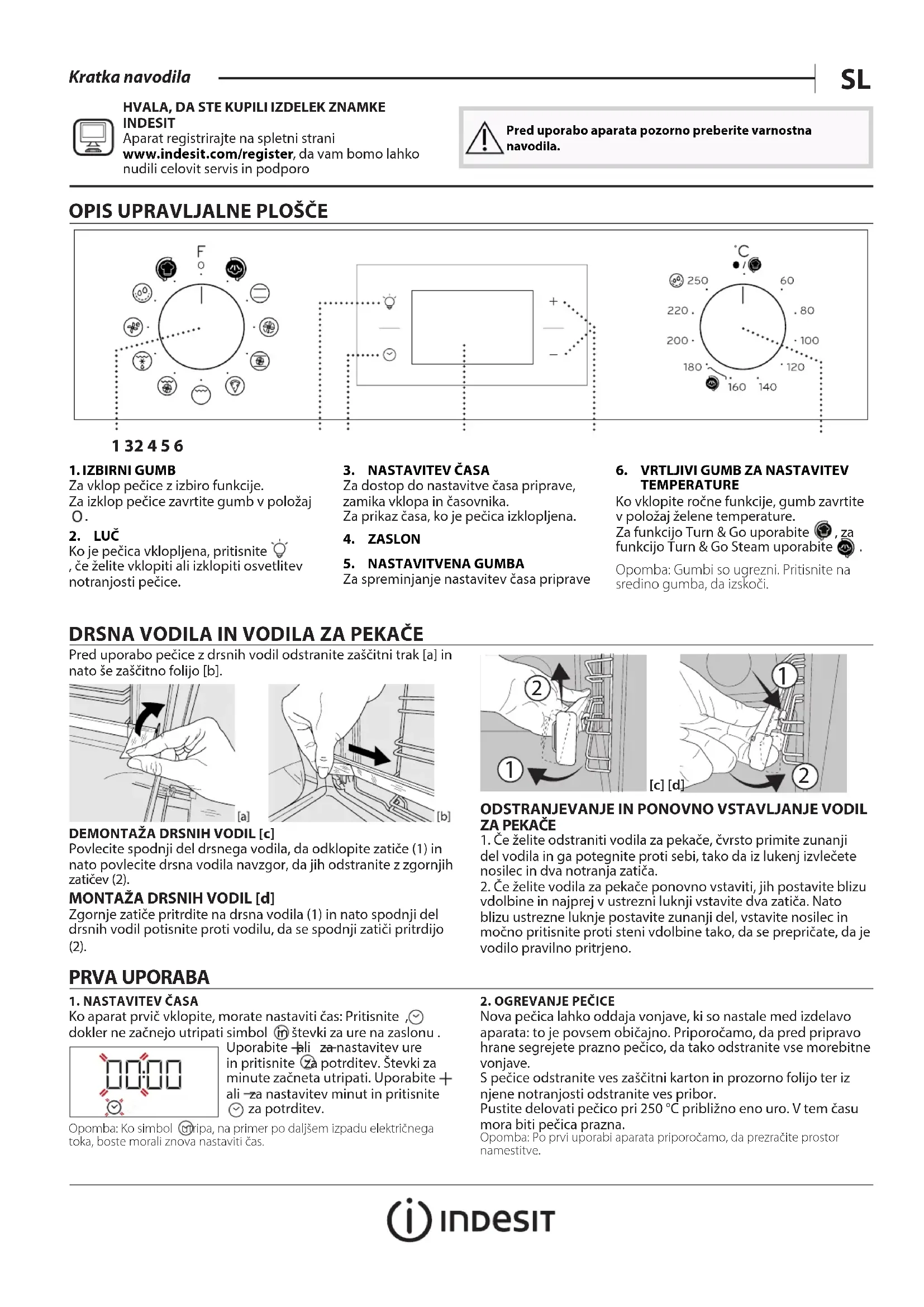 [c] [d]ODSTRANJEVANJE IN PONOVNO VSTAVLJANJE VODIL ZA PEKAČE1. Če želite odstraniti vodila za pekače, čvrsto primite zunanjidel vodila in ga potegnite proti sebi, tako da iz lukenj izvlečetenosilec in dva notranja zatiča.2. Če želite vodila za pekače ponovno vstaviti, jih postavite blizuvdolbine in najprej v ustrezni luknji vstavite dva zatiča. Natoblizu ustrezne luknje postavite zunanji del, vstavite nosilec inmočno pritisnite proti steni vdolbine tako, da se prepričate, da jevodilo pravilno pritrjeno.PRVA UPORABA1. NASTAVITEV ČASAKo aparat prvič vklopite, morate nastaviti čas: Pritisnite , dokler ne začnejo utripati simbol in števki za ure na zaslonu .Uporabite ali za nastavitev ure in pritisnite za potrditev. Števki za minute začneta utripati. Uporabite ali za nastavitev minut in pritisnite za potrditev.Opomba: Ko simbol utripa, na primer po daljšem izpadu električnega toka, boste morali znova nastaviti čas.2. OGREVANJE PEČICENova pečica lahko oddaja vonjave, ki so nastale med izdelavoaparata: to je povsem običajno. Priporočamo, da pred pripravohrane segrejete prazno pečico, da tako odstranite vse morebitnevonjave.S pečice odstranite ves zaščitni karton in prozorno folijo ter iznjene notranjosti odstranite ves pribor.Pustite delovati pečico pri 250 °C približno eno uro. V tem časumora biti pečica prazna.Opomba: Po prvi uporabi aparata priporočamo, da prezračite prostor namestitve.OPIS UPRAVLJALNE PLOŠČE1 32 4 5 61. IZBIRNI GUMBZa vklop pečice z izbiro funkcije.Za izklop pečice zavrtite gumb v položaj 2. LUČKo je pečica vklopljena, pritisnite , če želite vklopiti ali izklopiti osvetlitev notranjosti pečice.3. NASTAVITEV ČASAZa dostop do nastavitve časa priprave,zamika vklopa in časovnika.Za prikaz časa, ko je pečica izklopljena.4. ZASLON5. NASTAVITVENA GUMBAZa spreminjanje nastavitev časa priprave6. VRTLJIVI GUMB ZA NASTAVITEVTEMPERATUREKo vklopite ročne funkcije, gumb zavrtite v položaj želene temperature. Za funkcijo Turn & Go uporabite , za funkcijo Turn & Go Steam uporabite .Opomba: Gumbi so ugrezni. Pritisnite na sredino gumba, da izskoči.HVALA, DA STE KUPILI IZDELEK ZNAMKE INDESITAparat registrirajte na spletni strani www . indesit . com / register, da vam bomo lahko nudili celovit servis in podporoPred uporabo aparata pozorno preberite varnostna navodila.FUNKCIJE IN VSAKODNEVNA UPORABA