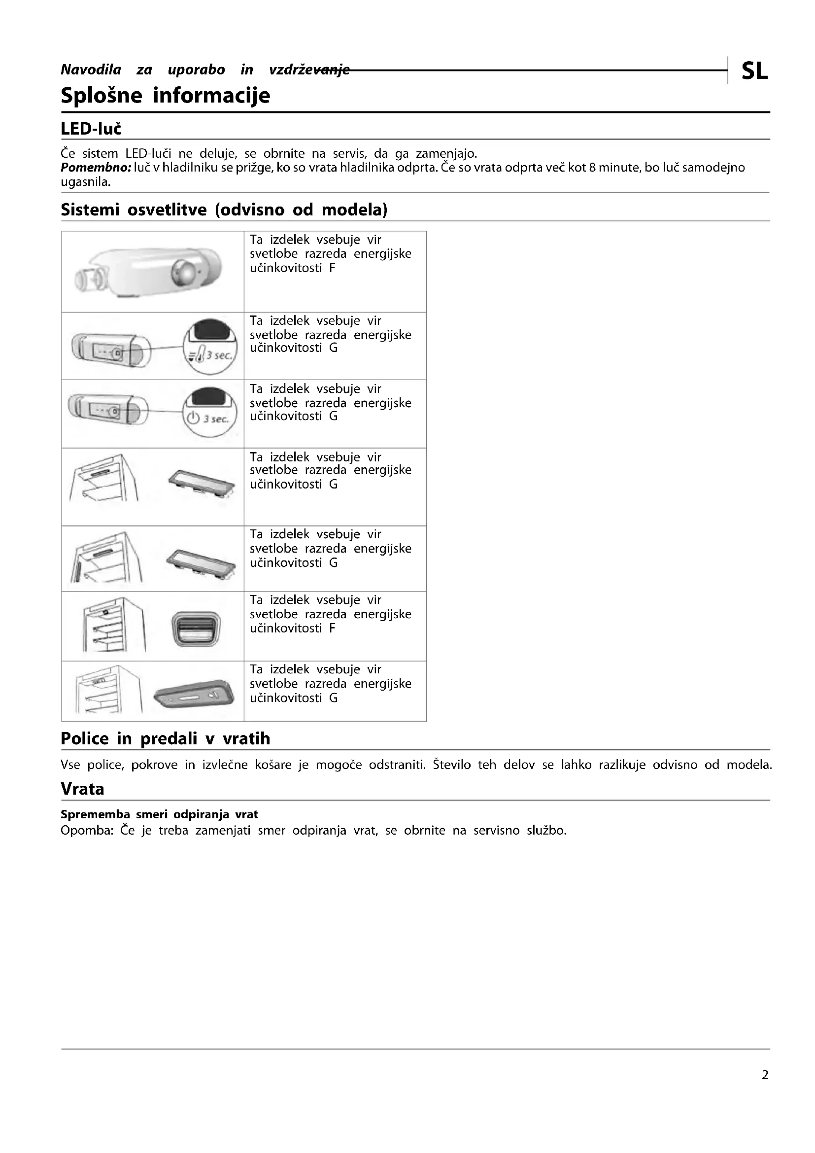 Splošne informacije LED-luč Če sistem LED-luči ne deluje, se obrnite na servis, da ga zamenjajo. Pomembno: luč v hladilniku se prižge, ko so vrata hladilnika odprta. Če so vrata odprta več kot 8 minute, bo luč samodejno ugasnila. Sistemi osvetlitve (odvisno od modela) Ta izdelek vsebuje vir svetlobe razreda energijske učinkovitosti F Ta izdelek vsebuje vir svetlobe razreda energijske učinkovitosti G Ta izdelek vsebuje vir svetlobe razreda energijske učinkovitosti G Ta izdelek vsebuje vir svetlobe razreda energijske učinkovitosti G Ta izdelek vsebuje vir svetlobe razreda energijske učinkovitosti G Ta izdelek vsebuje vir svetlobe razreda energijske učinkovitosti F Ta izdelek vsebuje vir svetlobe razreda energijske učinkovitosti G Police in predali v vratih Vse police, pokrove in izvlečne košare je mogoče odstraniti. Število teh delov se lahko razlikuje odvisno od modela. Vrata Sprememba smeri odpiranja vrat Opomba: Če je treba zamenjati smer odpiranja vrat, se obrnite na servisno službo.Navodila za uporabo in vzdrževanje