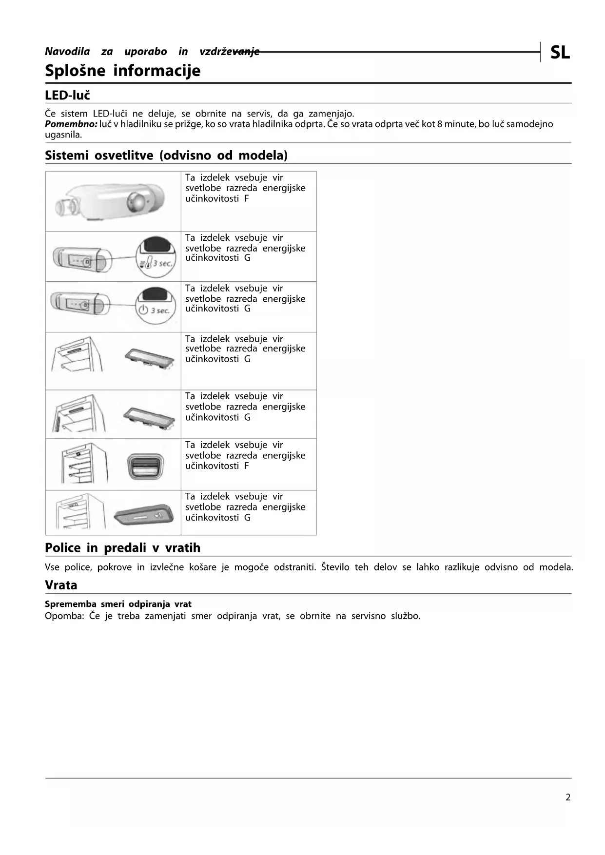 Splošne informacije LED-luč Če sistem LED-luči ne deluje, se obrnite na servis, da ga zamenjajo. Pomembno: luč v hladilniku se prižge, ko so vrata hladilnika odprta. Če so vrata odprta več kot 8 minute, bo luč samodejno ugasnila. Sistemi osvetlitve (odvisno od modela) Ta izdelek vsebuje vir svetlobe razreda energijske učinkovitosti F Ta izdelek vsebuje vir svetlobe razreda energijske učinkovitosti G Ta izdelek vsebuje vir svetlobe razreda energijske učinkovitosti G Ta izdelek vsebuje vir svetlobe razreda energijske učinkovitosti G Ta izdelek vsebuje vir svetlobe razreda energijske učinkovitosti G Ta izdelek vsebuje vir svetlobe razreda energijske učinkovitosti F Ta izdelek vsebuje vir svetlobe razreda energijske učinkovitosti G Police in predali v vratih Vse police, pokrove in izvlečne košare je mogoče odstraniti. Število teh delov se lahko razlikuje odvisno od modela. Vrata Sprememba smeri odpiranja vrat Opomba: Če je treba zamenjati smer odpiranja vrat, se obrnite na servisno službo.Navodila za uporabo in vzdrževanje