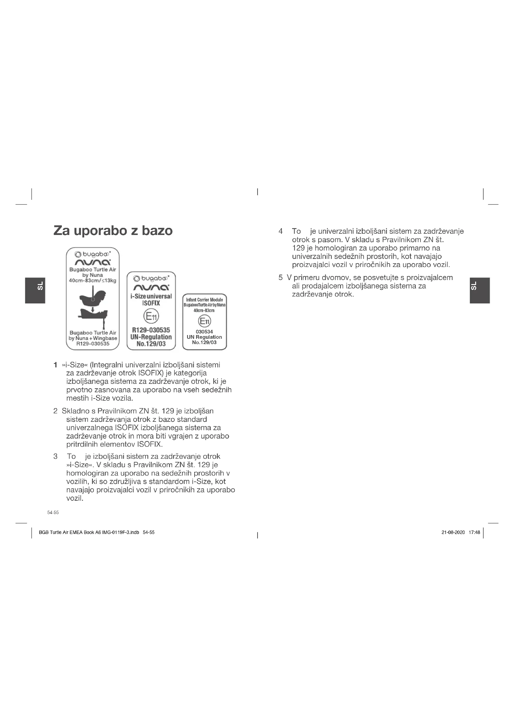 BGB Turtle Air EMEA Book A6 IMG-0119F-3.indb 54-55BGB Turtle Air EMEA Book A6 IMG-0119F-3.indb 54-55 21-08-2020 17:4821-08-2020 17:48Neupoštevanje teh opozoril in navodil lahko privede do resnih poškodb ali smrti. Vsi pasovi, ki pritrjujejo modul nosila za otroka na vozilo, morajo biti zategnjeni; podporna noga mora biti v stiku s tlemi vozila; pasovi, ki zadržujejo otroka, morajo biti prilagojeni glede na otrokovo telo in ti pasovi ne smejo biti zviti. Kakršna koli prtljaga in drugi predmeti, ki bi lahko v primeru trka povzročili poškodbe , morajo biti primerno pritrjeni. Prepričajte se, da je sistem za zadrževanje otrok nameščen na takšen način, da noben njegov del ne moti premičnih sedežev ali delovanja vrat vozila. Preden začnete s prenosom modula nosila za otroka z roko, se prepričajte, da je otrok pripet s H-pasom za otroke in, da je ročaj pravilno zaklenjen v pokončnem položaju. Glede težav povezanih z vzdrževanjem, popravilom in zamenjavo delov, se posvetujte z distributerjem. Pravilna namestitev je dovoljena samo z uporabo pritrdilnih elementov ISOFIX. Pogosto poglejte ali so vodila za ISOFIX umazana in jih po potrebi očistite. Na zanesljivost lahko vpliva vdor umazanije, prahu, delčkov hrane ipd. Pred nakupom tega izboljšanega sistema za zadrževanje otrok, preverite, ali ga lahko pravilno namestite v vaše vozilo. Ta izboljšani sistem za zadrževanje otrok brez prevleke iz tkanine držite stran od sončnih žarkov, saj lahko postane prevroč za otrokovo kožo. Preden vanj položite otroka, z dotikom vedno preverite izboljšani sistem za zadrževanje otrok. Za uporabo tega izboljšanega sistema za zadrževanje otrok s pritrdilnimi elementi ISOFIX, mora skladno s Pravilnikom ZN št. 129 vaš otrok izpolnjevati naslednje pogoje. Otrokova višina 40cm–83cm/Otrokova teža ≤13kg (starost približno 15 mesecev ali manj). Za uporabo tega modula nosila za otroka skupaj s pasom vozila, mora vaš otrok izpolnjevati naslednje pogoje. Otrokova višina 40cm–83cm. Otrokova teža ≤13kg/Otrokova starost ≤15 mesecev. Mehkih artiklov izboljšanega sistema za zadrževanje otrok ne smete zamenjati z nobenimi drugimi, kot le tistimi, ki jih priporoča proizvajalec, saj so mehki artikli sestavni del delovanja sistema za zadrževanje otrok. Da preprečite tveganje padca, otroka vedno pripnite s pomočjo H-pasu za otroke, kadar je otrok v modulu nosila za otroke, četudi izboljšani sistem za zadrževanje otrok ni v vozilu. Da preprečite nastanek resnih poškodb ali smrt, modula nosila za otroke NIKOLI ne polagajte na dvignjeno površino sedeža, kadar je otrok v njem. OPOZORILO