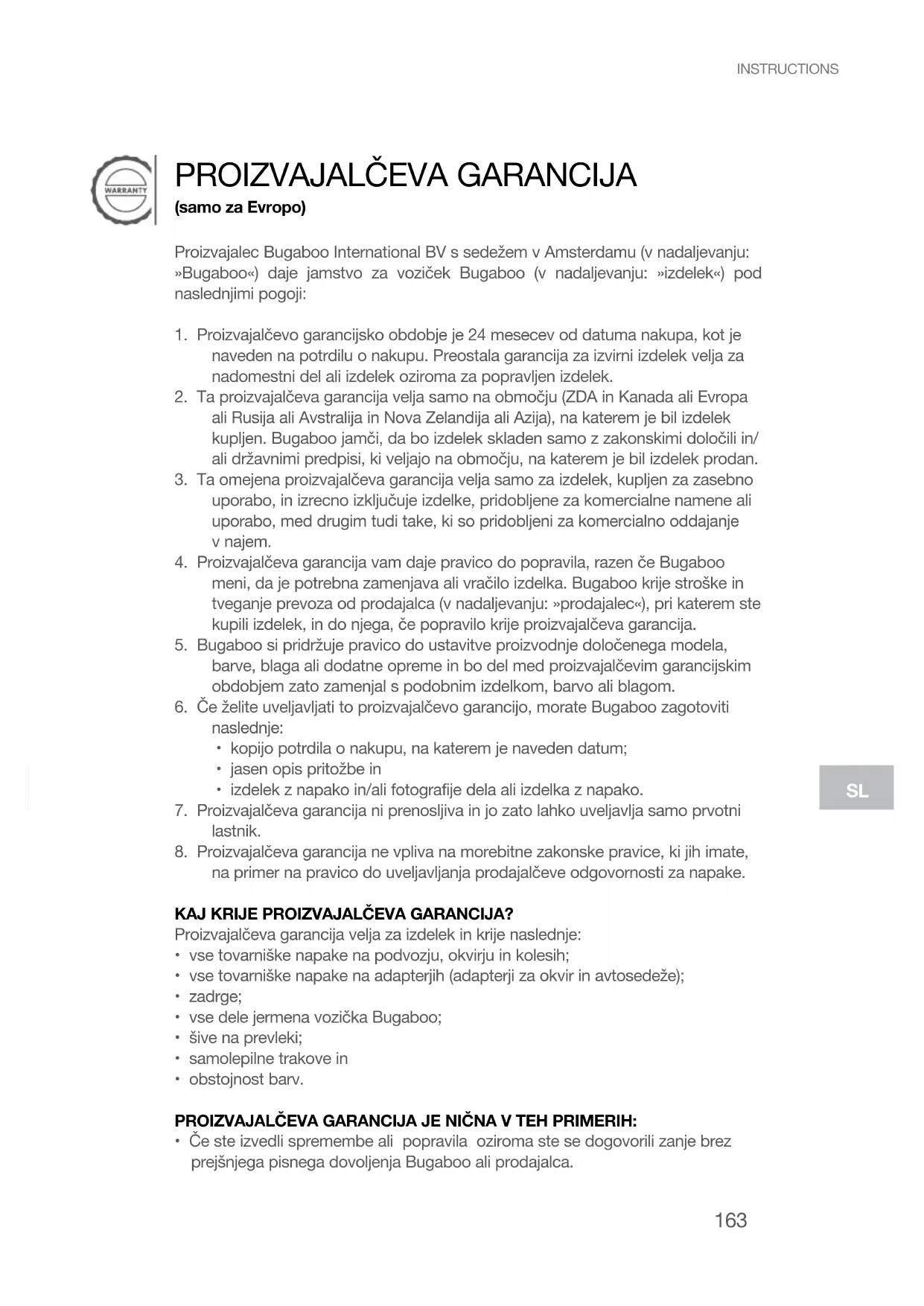 (samo za Evropo) Proizvajalec Bugaboo International BV s sedežem v Amsterdamu (v nadaljevanju: »Bugaboo«) daje jamstvo za voziček Bugaboo (v nadaljevanju: »izdelek«) pod naslednjimi pogoji: