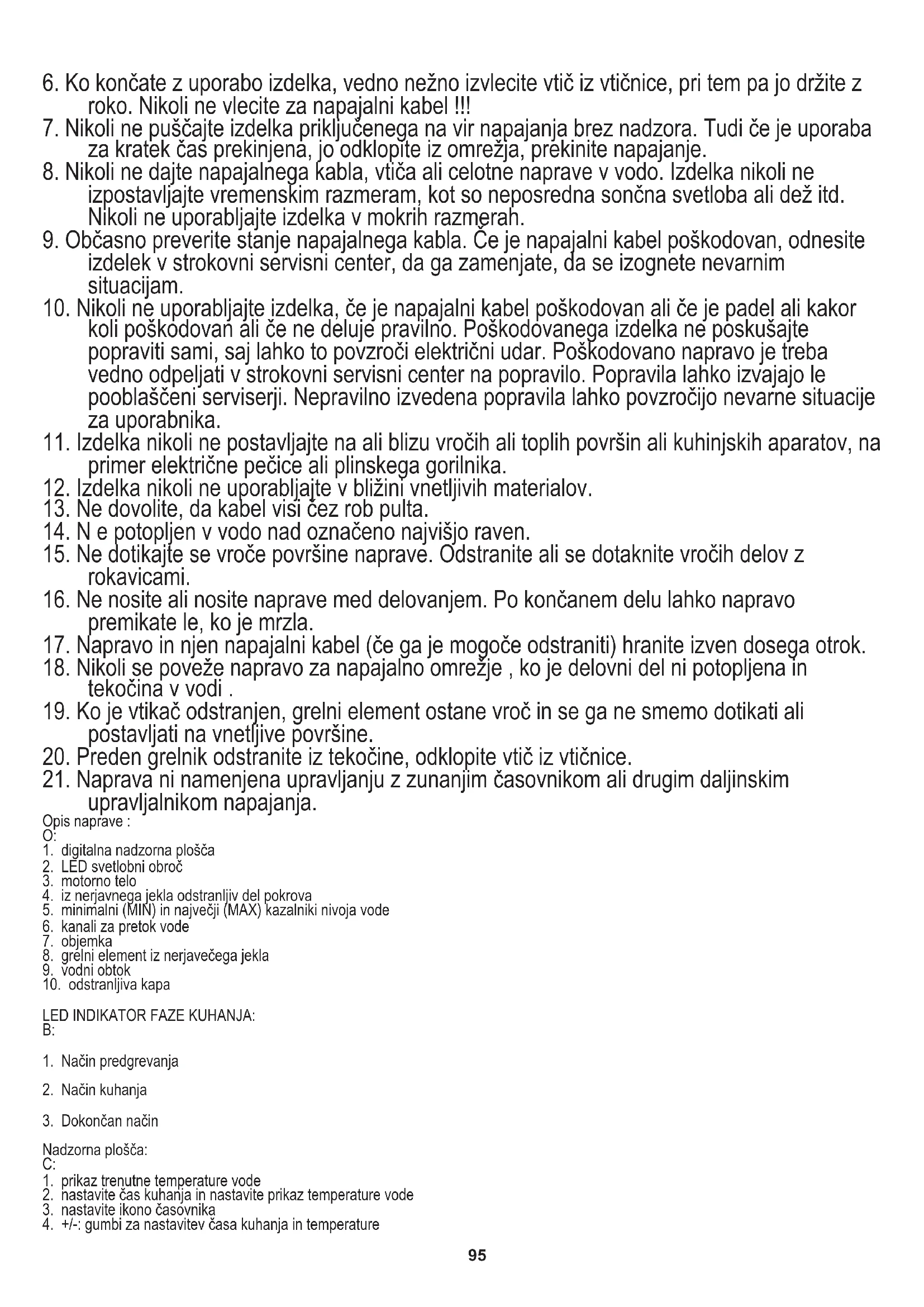 19. Ko je vtikač odstranjen, grelni element ostane vroč in se ga ne smemo dotikati ali