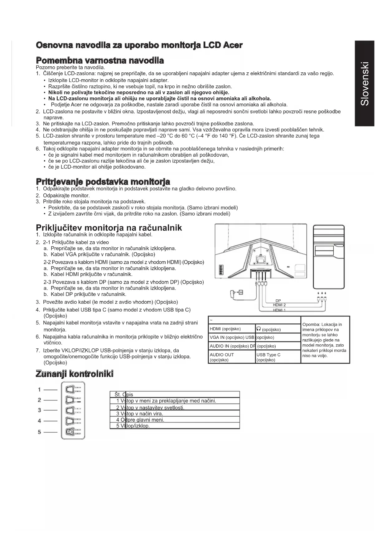 Opomba: Lokacija in imena priklopov na monitorju se lahko razlikujejo glede na model monitorja, zato nekateri priklopi morda niso na voljo. HDMI (opcijsko) (opcijsko) VGA IN (opcijsko) USB (opcijsko) AUDIO IN (opcijsko) DP (opcijsko) AUDIO OUT (opcijsko) USB Type C (opcijsko) Zunanji kontrolniki Št. Opis 1 Vstop v meni za preklapljanje med načini. 2 Vstop v nastavitev svetlosti. 3 Vstop v način vira. 4 Odpre glavni meni. 5 Vklop/izklop.Slovenski Regulativne in varnostne izjave Izjava FCC Ta oprema je bila preizkušena in se sklada z omejitvami za digitalne naprave razreda B, kot to določa 15. del pravil FCC. Te omejitve so zasnovane za zagotovitev primerne zaščite pred škodljivimi motnjami ob namestitvi opreme v stanovanjskih območjih. Ta oprema proizvaja, uporablja in lahko oddaja radiofrekvenčno energijo in če ni nameščena in uporabljena v skladu z navodili, lahko povzroča motnje v radijski komunikaciji. Vendar pa ni možno zagotoviti, da pri določeni namestitvi ne bo prišlo do motenj. Če naprava povzroča škodljive motnje sprejemu radijskega ali televizijskega signala, kar se lahko ugotovi z izključitvijo in vključitvijo stikalne naprave, priporočamo uporabniku, da poskuša preprečiti motnje z enim od naslednjih ukrepov: