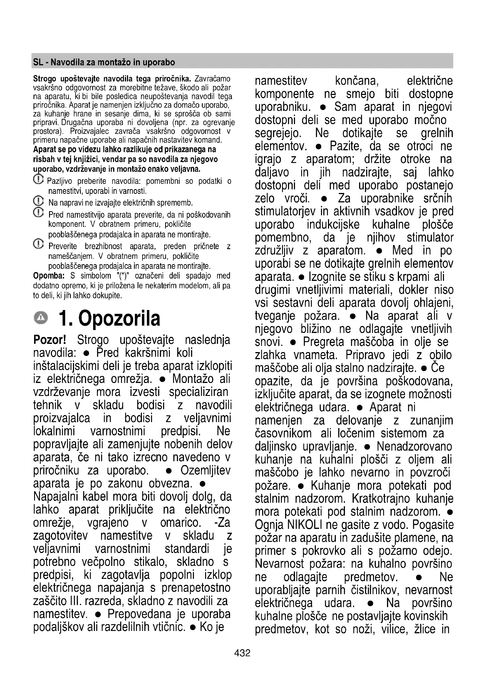Pozor! Strogo upoštevajte naslednja navodila: ● Pred kakršnimi koli inštalacijskimi deli je treba aparat izklopiti iz električnega omrežja. ● Montažo ali vzdrževanje mora izvesti specializiran tehnik v skladu bodisi z navodili proizvajalca in bodisi z veljavnimi lokalnimi varnostnimi predpisi. Ne popravljajte ali zamenjujte nobenih delov aparata, če ni tako izrecno navedeno v priročniku za uporabo. ● Ozemljitev aparata je po zakonu obvezna. ● Napajalni kabel mora biti dovolj dolg, da lahko aparat priključite na električno omrežje, vgrajeno v omarico. -Za zagotovitev namestitve v skladu z veljavnimi varnostnimi standardi je potrebno večpolno stikalo, skladno s predpisi, ki zagotavlja popolni izklop električnega napajanja s prenapetostno zaščito III. razreda, skladno z navodili za namestitev. ● Prepovedana je uporaba podaljškov ali razdelilnih vtičnic. ● Ko je namestitev končana, električne komponente ne smejo biti dostopne uporabniku. ● Sam aparat in njegovi dostopni deli se med uporabo močno segrejejo. Ne dotikajte se grelnih elementov. ● Pazite, da se otroci ne igrajo z aparatom; držite otroke na daljavo in jih nadzirajte, saj lahko dostopni deli med uporabo postanejo zelo vroči. ● Za uporabnike srčnih stimulatorjev in aktivnih vsadkov je pred uporabo indukcijske kuhalne plošče pomembno, da je njihov stimulator združljiv z aparatom. ● Med in po uporabi se ne dotikajte grelnih elementov aparata. ● Izognite se stiku s krpami ali drugimi vnetljivimi materiali, dokler niso vsi sestavni deli aparata dovolj ohlajeni, tveganje požara. ● Na aparat ali v njegovo bližino ne odlagajte vnetljivih snovi. ● Pregreta maščoba in olje se zlahka vnameta. Pripravo jedi z obilo maščobe ali olja stalno nadzirajte. ● Če opazite, da je površina poškodovana, izključite aparat, da se izognete možnosti električnega udara. ● Aparat ni namenjen za delovanje z zunanjim časovnikom ali ločenim sistemom za daljinsko upravljanje. ● Nenadzorovano kuhanje na kuhalni plošči z oljem ali maščobo je lahko nevarno in povzroči požare. ● Kuhanje mora potekati pod stalnim nadzorom. Kratkotrajno kuhanje mora potekati pod stalnim nadzorom. ● Ognja NIKOLI ne gasite z vodo. Pogasite požar na aparatu in zadušite plamene, na primer s pokrovko ali s požarno odejo. Nevarnost požara: na kuhalno površino ne odlagajte predmetov. ● Ne uporabljajte parnih čistilnikov, nevarnost električnega udara. ● Na površino kuhalne plošče ne postavljajte kovinskih predmetov, kot so noži, vilice, žlice in433 pokrovi, ker bi se lahko pregreli. ● Preden aparat priključite v električno omrežje: preverite podatkovno tablico (nameščeno na dnu aparata) in se prepričajte, da napetost in moč ustrezata napetosti omrežja in da je priključna vtičnica primerna. V primeru dvomov se posvetujte s kvalificiranim električarjem. Pomembno: ● Po uporabi izključite kuhalno ploščo s pomočjo svoje krmilne naprave in ne zanašajte se na detektor posod. ● Izogibajte se razlitju tekočine, zato pri vretju ali segrevanju tekočine, zmanjšajte dovod toplote. ● Grelne elemente ne puščajte vklopljene in s prazno posodo ali brez nje na kuhališču. ● Ko končate s kuhanjem, izklopite odgovarjajoče kuhališče. ● Nikoli ne uporabljajte aluminijaste folije za kuhanje, in nikoli ne postavljajte izdelkov, pakiranih z aluminijem. Aluminij se lahko stali in nepopravljivo poškoduje vaš aparat. ● Nikoli ne segrevajte pločevink ali konzerv s hrano, ne da bi jih pred tem odprli, saj jih lahko raznese! To opozorilo velja tudi za vse druge vrste kuhalnih plošč. ● Uporaba visoke stopnje moči, kakršna je funkcija "Booster", ni primerna za segrevanje nekaterih tekočin, kot je na primer olje za cvrtje. Prevelika toplota je lahko nevarna. V teh primerih je priporočljivo uporabiti nižjo energetsko stopnjo. ● posode morajo biti nameščene neposredno na kuhalno ploščo in morajo biti v središču. V nobenem primeru med lonec in kuhalno ploščo ne vstavljajte drugih predmetov. ● Če je temperatura previsoka, aparat samodejno zniža stopnjo moči kuhališč. ● Pred vsakim postopkom čiščenja ali vzdrževanja aparat izklopite iz električnega omrežja tako, da izvlečete vtič ali odklopite z glavnim stikalom stanovanja. ● Pri vseh postopkih montaže in vzdrževanja nosite delovne rokavice. ● Aparat lahko uporabljajo otroci, starejši od 8 let, in osebe z zmanjšanimi fizičnimi, senzoričnimi ali duševnimi sposobnostmi ali s pomanjkanjem izkušenj ali potrebnega znanja, pod pogojem, da jih nekdo nadzoruje, ali po tem, ko prejmejo navodila bodisi glede varne uporabe aparata bodisi razumevanja nevarnosti, ki jim pretijo. ● Otroke je potrebno nadzorovati in zagotoviti, da se z aparatom ne igrajo. ● Otroci ne smejo čistiti in vzdrževati aparata, če niso pod nadzorom. ● Prostor mora imeti zadostno prezračevanje, kadar aparat uporabljate sočasno z drugimi aparati, ki za zgorevanje uporabljajo plin ali druga goriva. ● Aparat je treba pogosto čistiti, tako notranjost kot tudi zunanjost (VSAJ ENKRAT MESEČNO), v vsakem primeru pa upoštevajte, kar je izrecno navedeno v navodilih za vzdrževanje. ● Neupoštevanje pravil za čiščenje aparata in zamenjavo ter čiščenje filtrov pomeni tveganje za požar. ● Kuhanje s flambiranjem je strogo prepovedano. ● Uporaba prostega plamena je škodljiva za filtre in lahko povzroči požar, zato se je v vsakem primeru temu treba izogniti. ● Cvrtje je potrebno nadzirati, da se prepreči vnetje pregretega olja. ● POZOR: Med delovanjem kuhališča se dostopni deli aparata lahko segrejejo. ● Pozor! Aparata ne priključujte na električno omrežje, dokler namestitev ni popolnoma končana. ● Kar zadeva tehnične in varnostne ukrepe, ki jih je treba sprejeti za odvajanje hlapov, dosledno upoštevajte določbe predpisov pristojnih lokalnih organov. ● Vsesanega zraka se ne sme odvajati v vod, ki se up