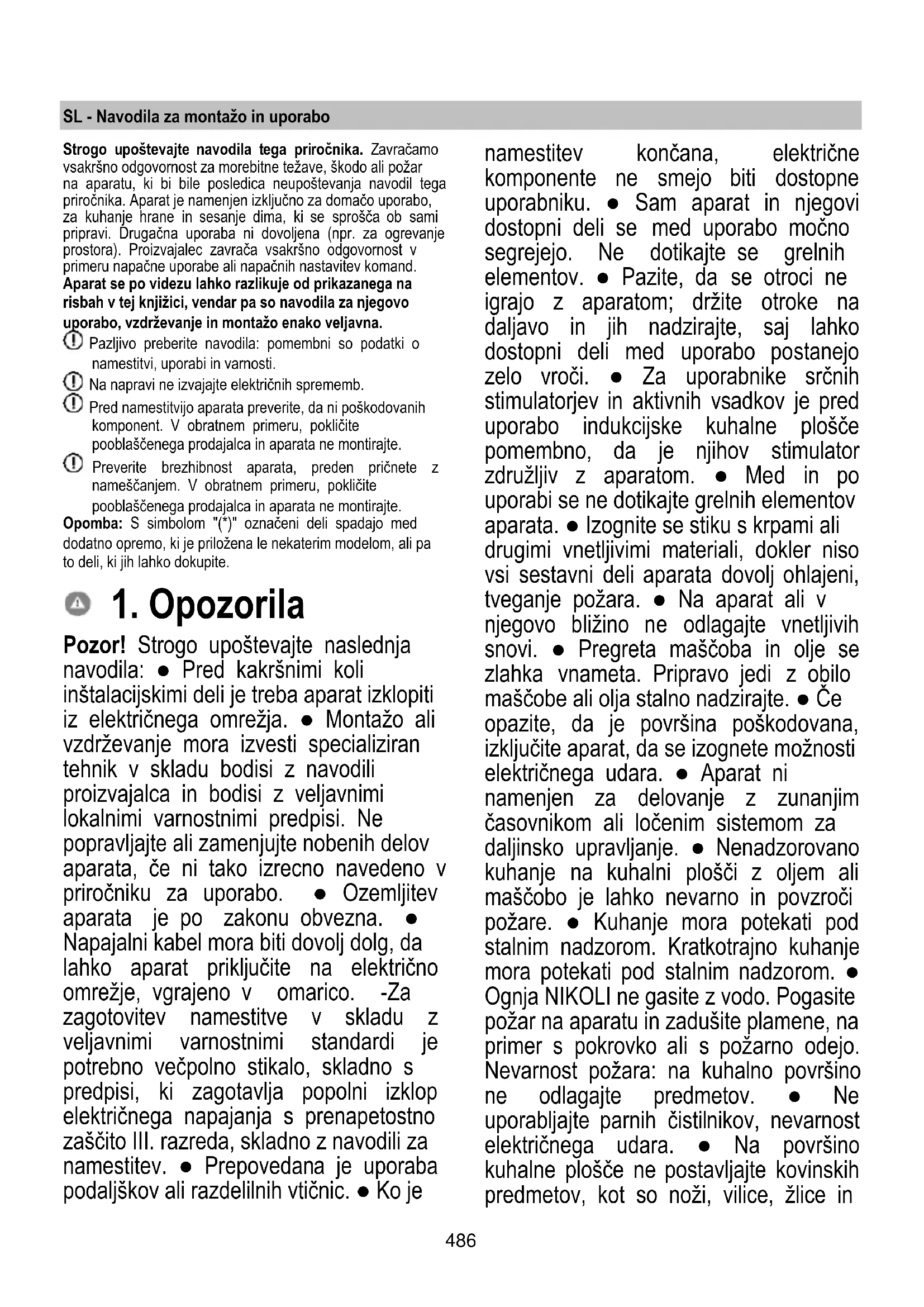 Pozor! Strogo upoštevajte naslednja navodila: ● Pred kakršnimi koli inštalacijskimi deli je treba aparat izklopiti iz električnega omrežja. ● Montažo ali vzdrževanje mora izvesti specializiran tehnik v skladu bodisi z navodili proizvajalca in bodisi z veljavnimi lokalnimi varnostnimi predpisi. Ne popravljajte ali zamenjujte nobenih delov aparata, če ni tako izrecno navedeno v priročniku za uporabo. ● Ozemljitev aparata je po zakonu obvezna. ● Napajalni kabel mora biti dovolj dolg, da lahko aparat priključite na električno omrežje, vgrajeno v omarico. -Za zagotovitev namestitve v skladu z veljavnimi varnostnimi standardi je potrebno večpolno stikalo, skladno s predpisi, ki zagotavlja popolni izklop električnega napajanja s prenapetostno zaščito III. razreda, skladno z navodili za namestitev. ● Prepovedana je uporaba podaljškov ali razdelilnih vtičnic. ● Ko je namestitev končana, električne komponente ne smejo biti dostopne uporabniku. ● Sam aparat in njegovi dostopni deli se med uporabo močno segrejejo. Ne dotikajte se grelnih elementov. ● Pazite, da se otroci ne igrajo z aparatom; držite otroke na daljavo in jih nadzirajte, saj lahko dostopni deli med uporabo postanejo zelo vroči. ● Za uporabnike srčnih stimulatorjev in aktivnih vsadkov je pred uporabo indukcijske kuhalne plošče pomembno, da je njihov stimulator združljiv z aparatom. ● Med in po uporabi se ne dotikajte grelnih elementov aparata. ● Izognite se stiku s krpami ali drugimi vnetljivimi materiali, dokler niso vsi sestavni deli aparata dovolj ohlajeni, tveganje požara. ● Na aparat ali v njegovo bližino ne odlagajte vnetljivih snovi. ● Pregreta maščoba in olje se zlahka vnameta. Pripravo jedi z obilo maščobe ali olja stalno nadzirajte. ● Če opazite, da je površina poškodovana, izključite aparat, da se izognete možnosti električnega udara. ● Aparat ni namenjen za delovanje z zunanjim časovnikom ali ločenim sistemom za daljinsko upravljanje. ● Nenadzorovano kuhanje na kuhalni plošči z oljem ali maščobo je lahko nevarno in povzroči požare. ● Kuhanje mora potekati pod stalnim nadzorom. Kratkotrajno kuhanje mora potekati pod stalnim nadzorom. ● Ognja NIKOLI ne gasite z vodo. Pogasite požar na aparatu in zadušite plamene, na primer s pokrovko ali s požarno odejo. Nevarnost požara: na kuhalno površino ne odlagajte predmetov. ● Ne uporabljajte parnih čistilnikov, nevarnost električnega udara. ● Na površino kuhalne plošče ne postavljajte kovinskih predmetov, kot so noži, vilice, žlice in487 pokrovi, ker bi se lahko pregreli. ● Preden aparat priključite v električno omrežje: preverite podatkovno tablico (nameščeno na dnu aparata) in se prepričajte, da napetost in moč ustrezata napetosti omrežja in da je priključna vtičnica primerna. V primeru dvomov se posvetujte s kvalificiranim električarjem. Pomembno: ● Po uporabi izključite kuhalno ploščo s pomočjo svoje krmilne naprave in ne zanašajte se na detektor posod. ● Izogibajte se razlitju tekočine, zato pri vretju ali segrevanju tekočine, zmanjšajte dovod toplote. ● Grelne elemente ne puščajte vklopljene in s prazno posodo ali brez nje na kuhališču. ● Ko končate s kuhanjem, izklopite odgovarjajoče kuhališče. ● Nikoli ne uporabljajte aluminijaste folije za kuhanje, in nikoli ne postavljajte izdelkov, pakiranih z aluminijem. Aluminij se lahko stali in nepopravljivo poškoduje vaš aparat. ● Nikoli ne segrevajte pločevink ali konzerv s hrano, ne da bi jih pred tem odprli, saj jih lahko raznese! To opozorilo velja tudi za vse druge vrste kuhalnih plošč. ● Uporaba visoke stopnje moči, kakršna je funkcija "Booster", ni primerna za segrevanje nekaterih tekočin, kot je na primer olje za cvrtje. Prevelika toplota je lahko nevarna. V teh primerih je priporočljivo uporabiti nižjo energetsko stopnjo. ● posode morajo biti nameščene neposredno na kuhalno ploščo in morajo biti v središču. V nobenem primeru med lonec in kuhalno ploščo ne vstavljajte drugih predmetov. ● Če je temperatura previsoka, aparat samodejno zniža stopnjo moči kuhališč. ● Pred vsakim postopkom čiščenja ali vzdrževanja aparat izklopite iz električnega omrežja tako, da izvlečete vtič ali odklopite z glavnim stikalom stanovanja. ● Pri vseh postopkih montaže in vzdrževanja nosite delovne rokavice. ● Aparat lahko uporabljajo otroci, starejši od 8 let, in osebe z zmanjšanimi fizičnimi, senzoričnimi ali duševnimi sposobnostmi ali s pomanjkanjem izkušenj ali potrebnega znanja, pod pogojem, da jih nekdo nadzoruje, ali po tem, ko prejmejo navodila bodisi glede varne uporabe aparata bodisi razumevanja nevarnosti, ki jim pretijo. ● Otroke je potrebno nadzorovati in zagotoviti, da se z aparatom ne igrajo. ● Otroci ne smejo čistiti in vzdrževati aparata, če niso pod nadzorom. ● Prostor mora imeti zadostno prezračevanje, kadar aparat uporabljate sočasno z drugimi aparati, ki za zgorevanje uporabljajo plin ali druga goriva. ● Aparat je treba pogosto čistiti, tako notranjost kot tudi zunanjost (VSAJ ENKRAT MESEČNO), v vsakem primeru pa upoštevajte, kar je izrecno navedeno v navodilih za vzdrževanje. ● Neupoštevanje pravil za čiščenje aparata in zamenjavo ter čiščenje filtrov pomeni tveganje za požar. ● Kuhanje s flambiranjem je strogo prepovedano. ● Uporaba prostega plamena je škodljiva za filtre in lahko povzroči požar, zato se je v vsakem primeru temu treba izogniti. ● Cvrtje je potrebno nadzirati, da se prepreči vnetje pregretega olja. ● POZOR: Med delovanjem kuhališča se dostopni deli aparata lahko segrejejo. ● Pozor! Aparata ne priključujte na električno omrežje, dokler namestitev ni popolnoma končana. ● Kar zadeva tehnične in varnostne ukrepe, ki jih je treba sprejeti za odvajanje hlapov, dosledno upoštevajte določbe predpisov pristojnih lokalnih organov. ● Vsesanega zraka se ne sme odvajati v vod, ki se up