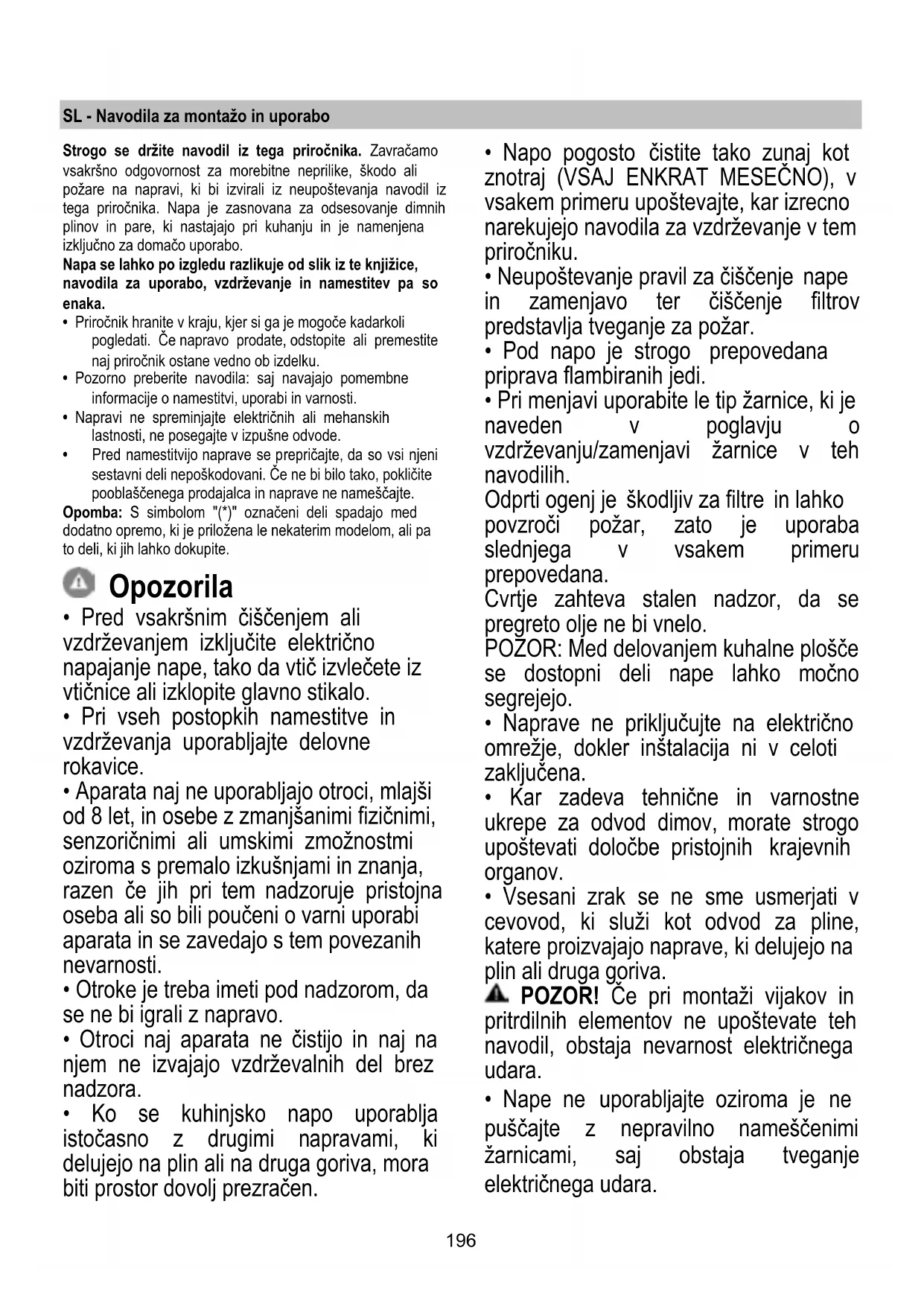 - Neupoštevanje pravil za čiščenje nape in zamenjavo ter čiščenje filtrov predstavlja tveganje za požar.