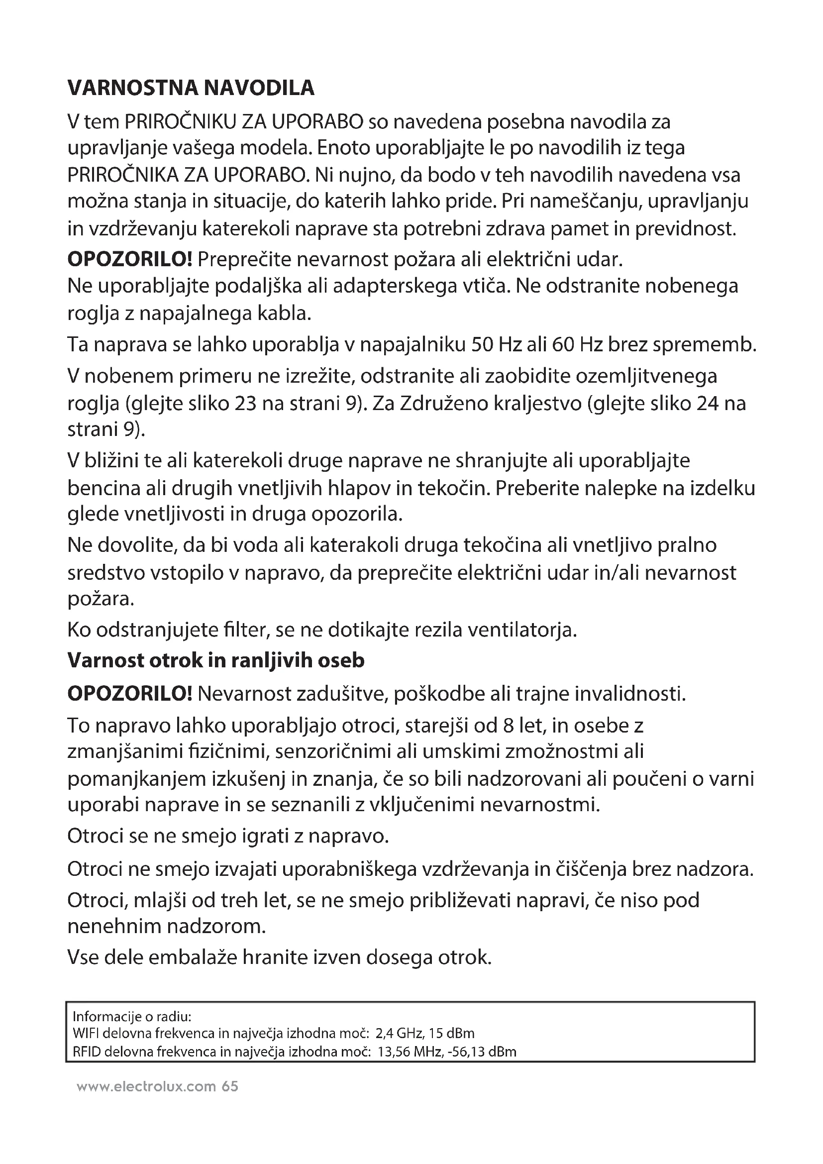 CSwww.electrolux.com 65 VARNOSTNA NAVODILA V tem PRIROČNIKU ZA UPORABO so navedena posebna navodila za upravljanje vašega modela. Enoto uporabljajte le po navodilih iz tega PRIROČNIKA ZA UPORABO. Ni nujno, da bodo v teh navodilih navedena vsa možna stanja in situacije, do katerih lahko pride. Pri nameščanju, upravljanju in vzdrževanju katerekoli naprave sta potrebni zdrava pamet in previdnost. OPOZORILO! Preprečite nevarnost požara ali električni udar. Neuporabljajte podaljška ali adapterskega vtiča. Ne odstranite nobenega roglja z napajalnega kabla. Ta naprava se lahko uporablja v napajalniku 50 Hz ali 60 Hz brez sprememb. V nobenem primeru ne izrežite, odstranite ali zaobidite ozemljitvenega roglja (glejte sliko 23 na strani 9). Za Združeno kraljestvo (glejte sliko 24na strani 9). V bližini te ali katerekoli druge naprave ne shranjujte ali uporabljajte bencina ali drugih vnetljivih hlapov in tekočin. Preberite nalepke na izdelku glede vnetljivosti in druga opozorila. Ne dovolite, da bi voda ali katerakoli druga tekočina ali vnetljivo pralno sredstvo vstopilo v napravo, da preprečite električni udar in/ali nevarnost požara. Ko odstranjujete lter, se ne dotikajte rezila ventilatorja. Varnost otrok in ranljivih oseb OPOZORILO! Nevarnost zadušitve, poškodbe ali trajne invalidnosti. To napravo lahko uporabljajo otroci, starejši od 8 let, in osebe z zmanjšanimi zičnimi, senzoričnimi ali umskimi zmožnostmi ali pomanjkanjem izkušenj in znanja, če so bili nadzorovani ali poučeni ovarni uporabi naprave in se seznanili z vključenimi nevarnostmi. Otroci se ne smejo igrati z napravo. Otroci ne smejo izvajati uporabniškega vzdrževanja in čiščenja brez nadzora. Otroci, mlajši od treh let, se ne smejo približevati napravi, če niso pod nenehnim nadzorom. Vse dele embalaže hranite izven dosega otrok. Informacije o radiu: WIFI delovna frekvenca in največja izhodna moč: 2,4 GHz, 15 dBm RFID delovna frekvenca in največja izhodna moč: 13,56 MHz, -56,13 dBmwww.electrolux.com66 Električne informacije OPOZORILO! Preprečite nevarnost požara ali električniudar. Če niste prepričani, ali je vtičnica ustrezno ozemljena ali zaščitena s počasno varovalko ali prekinjalom, naj usposobljen električar namesti ustrezno vtičnico v skladu z nacionalnim električnim zakonikom in veljavnimi krajevnimi zakoniki ter uredbami. Ne uporabljajte podaljška ali adapterskega vtiča. Enote nikoli ne iztaknite iz vtičnice s potegom za napajalni kabel. Vedno trdno primite vtič in ga izvlecite naravnost iz vtičnice. Ne stiskajte, ukrivljajte ali prepletajte napajalnega kabla. Ne režite ali kako drugače poškodujte napajalnega kabla. Če se napajalni kabel poškoduje, ga lahko zamenja le pooblaščeni Electroluxov serviser. Ta enota nima delov, ki jih lahko popravlja uporabnik. Za popravila vedno pokličite pooblaščenega Electroluxovega serviserja. Če je napajalni kabel poškodovan, ga mora zamenjati predstavnik proizvajalca, pooblaščene servisne službe ali druga strokovno usposobljena oseba, da se izognete nevarnosti. Pred čiščenjem enoto izklopite iz električnega omrežja, da preprečite udar ali nevarnosti požara. Varnostni previdnostni ukrepi POZOR! Preprečite hude poškodbe ali smrt. Ne vstavljajte ali polagajte prstov ali predmetov v predel za odvajanje zraka ali sprednjo rešetko enote. Enote ne vklapljajte ali izklapljajte z iztaknitvijo napajalnega kabla iz vtičnice ali izklopom napajanja velektrični omarici. V primeru motenj (iskre, vonj po zažganem, itd.) takoj prekinite delovanje, iztaknite napajalni kabel iz vtičnice in pokličite pooblaščenega Electroluxovega serviserja. Enote ne upravljajte z mokrimi rokami. Ne vlecite za napajalni kabel. POZOR! Preprečite telesne poškodbe ali škodo na enoti ali drugi lastnini. Zračnega toka ne usmerjajte v kamine ali druge toplotne vire, ker lahko to povzroči nenadno vzplamtenje. Ne vzpenjajte se na enoto in nanjo ne postavljajte predmetov. Na enoto ne obešajte predmetov. Na enoto ne postavljajte posod s tekočino. Ko enote ne boste uporabljali dalj časa, jo izključite iznapajanja. Enota naj deluje z nameščenim zračnim ltrom. Ne zapirajte ali prekrivajte rešetke za dovod zraka, predela za odvajanje zraka in izhodnih odprtin. Zagotovite, da bo vsa električna/elektronska oprema oddaljena od enote 30 cm. Ta simbol na izdelku ali na njegovi embalaži označuje, da z izdelkom ni dovoljeno ravnati kot zobičajnimi gospodinjskimi odpadki. Če želite svoj izdelek reciklirati, ga odnesite na uradno zbirno mesto ali v Electroluxov servisni center, ki lahko ODSTRANITEV varno in profesionalno odstrani in reciklira baterijo in električne dele. Upoštevajte pravila države za ločeno zbiranje električnih izdelkov in polnilnih baterij.