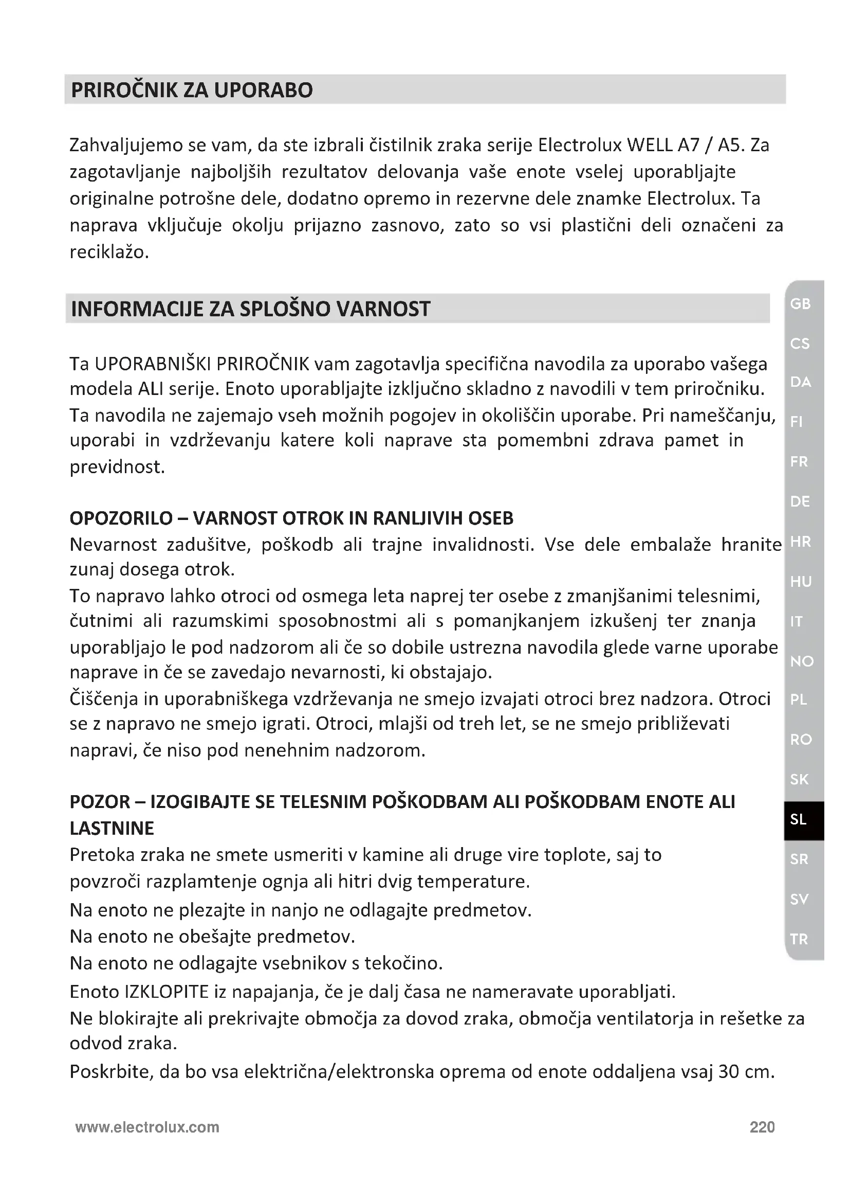 Zahvaljujemo se vam, da ste izbrali čistilnik zraka serije Electrolux WELL A7 / A5. Za zagotavljanje najboljših rezultatov delovanja vaše enote vselej uporabljajte originalne potrošne dele, dodatno opremo in rezervne dele znamke Electrolux. Ta naprava vključuje okolju prijazno zasnovo, zato so vsi plastični deli označeni za reciklažo.
