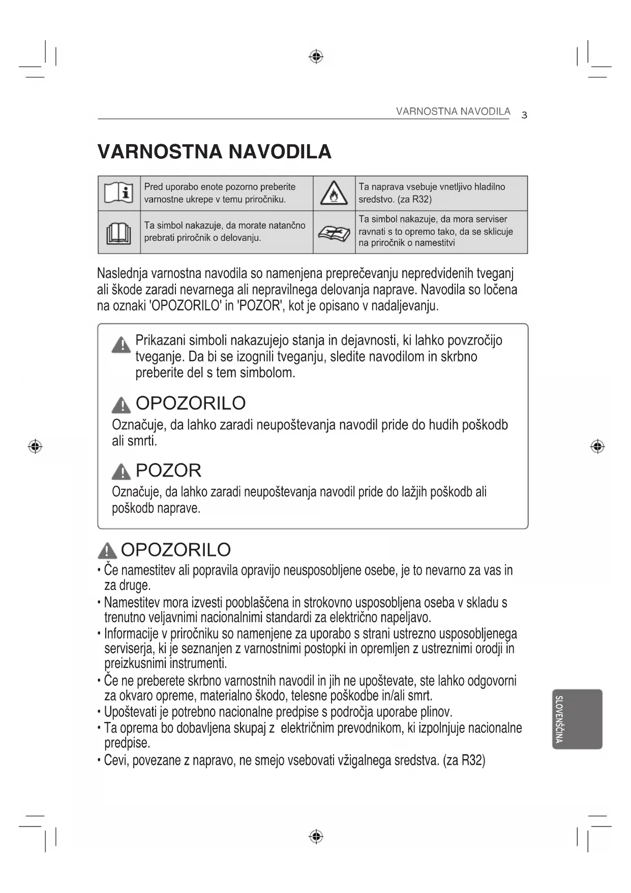 Pred uporabo enote pozorno preberite varnostne ukrepe v temu priročniku. Ta naprava vsebuje vnetljivo hladilno sredstvo. (za R32) Ta simbol nakazuje, da morate natančno prebrati priročnik o delovanju. Ta simbol nakazuje, da mora serviser ravnati s to opremo tako, da se sklicuje na priročnik o namestitvi OPOZORILO Označuje, da lahko zaradi neupoštevanja navodil pride do hudih poškodb ali smrti. POZOR Označuje, da lahko zaradi neupoštevanja navodil pride do lažjih poškodb ali poškodb naprave. Prikazani simboli nakazujejo stanja in dejavnosti, ki lahko povzročijo tveganje. Da bi se izognili tveganju, sledite navodilom in skrbno preberite del s tem simbolom.