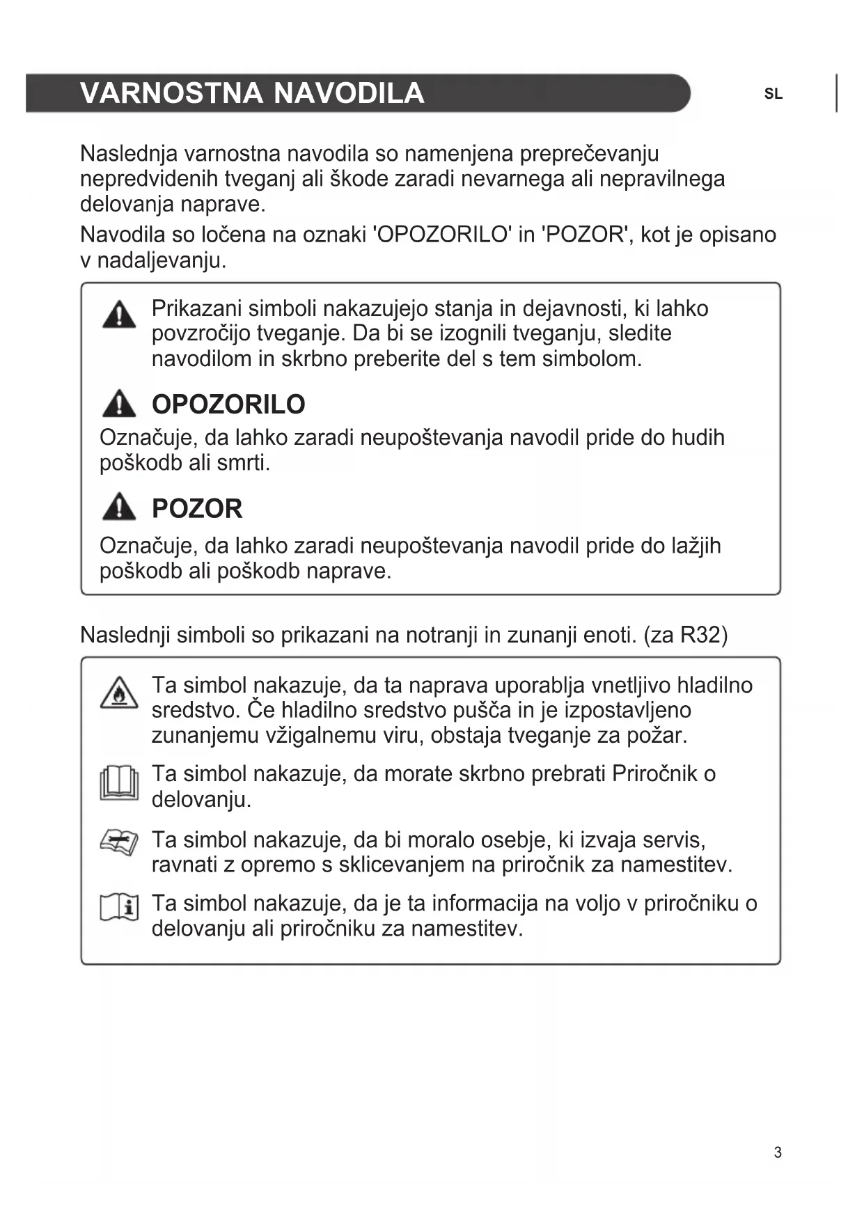 VARNOSTNA NAVODILA Naslednja varnostna navodila so namenjena preprečevanju nepredvidenih tveganj ali škode zaradi nevarnega ali nepravilnega delovanja naprave. Navodila so ločena na oznaki 'OPOZORILO' in 'POZOR', kot je opisano v nadaljevanju. Prikazani simboli nakazujejo stanja in dejavnosti, ki lahko povzročijo tveganje. Da bi se izognili tveganju, sledite navodilom in skrbno preberite del s tem simbolom. OPOZORILO Označuje, da lahko zaradi neupoštevanja navodil pride do hudih poškodb ali smrti. POZOR Označuje, da lahko zaradi neupoštevanja navodil pride do lažjih poškodb ali poškodb naprave. Naslednji simboli so prikazani na notranji in zunanji enoti. (za R32) Ta simbol nakazuje, da ta naprava uporablja vnetljivo hladilno sredstvo. Če hladilno sredstvo pušča in je izpostavljeno zunanjemu vžigalnemu viru, obstaja tveganje za požar. Ta simbol nakazuje, da morate skrbno prebrati Priročnik o delovanju. Ta simbol nakazuje, da bi moralo osebje, ki izvaja servis, ravnati z opremo s sklicevanjem na priročnik za namestitev. Ta simbol nakazuje, da je ta informacija na voljo v priročniku o delovanju ali priročniku za namestitev.4