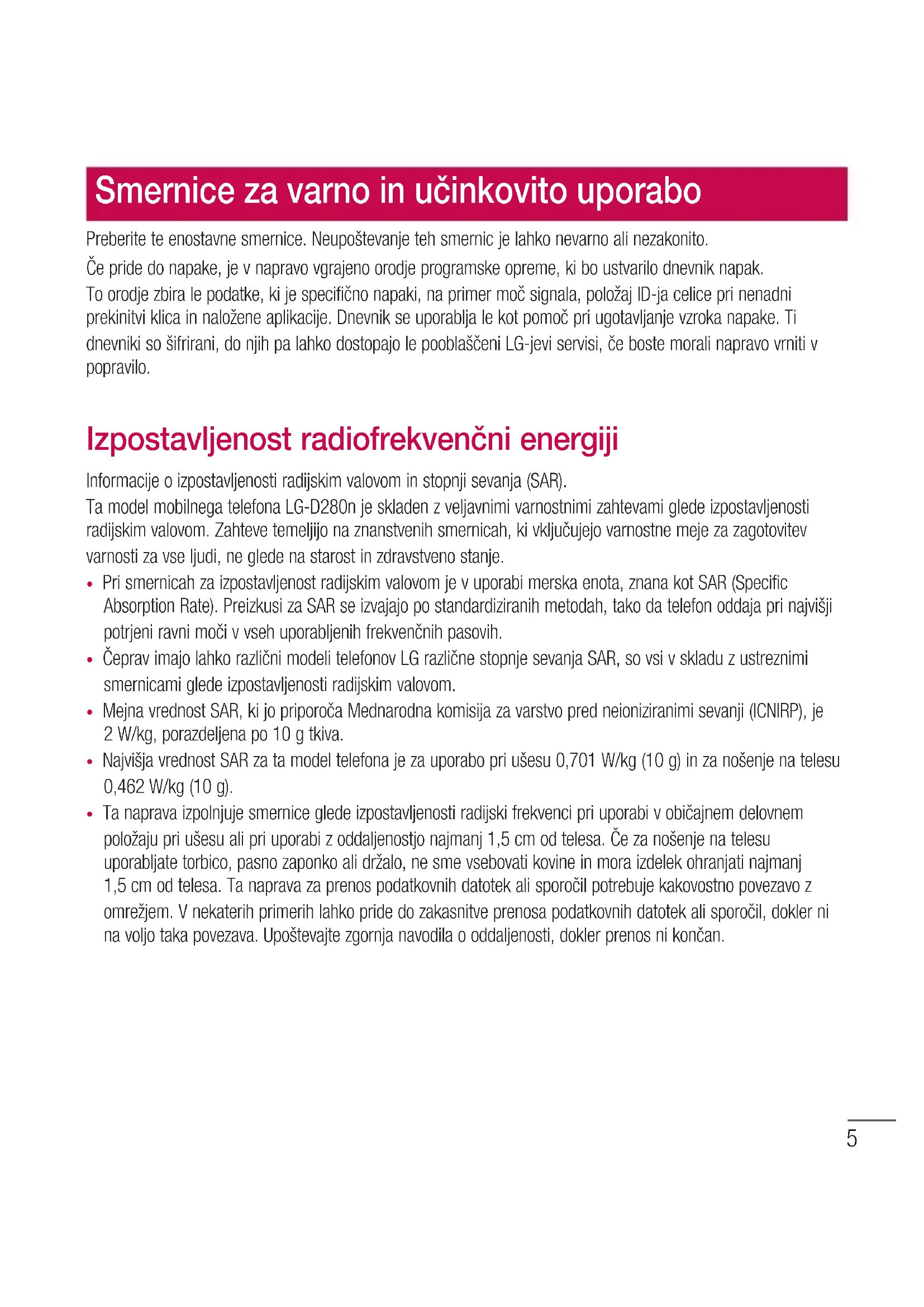 - Čeprav imajo lahko različni modeli telefonov LG različne stopnje sevanja SAR, so vsi v skladu z ustreznimi smernicami glede izpostavljenosti radijskim valovom.