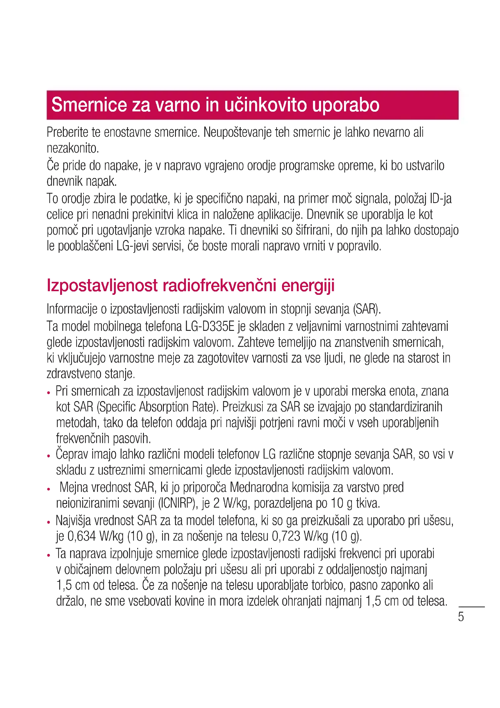 - Ta naprava izpolnjuje smernice glede izpostavljenosti radijski frekvenci pri uporabi v običajnem delovnem položaju pri ušesu ali pri uporabi z oddaljenostjo najmanj 1,5 cm od telesa. Če za nošenje na telesu uporabljate torbico, pasno zaponko ali držalo, ne sme vsebovati kovine in mora izdelek ohranjati najmanj 1,5 cm od telesa. Smernice za varno in učinkovito uporabo6 Smernice za varno in učinkovito uporabo Ta naprava za prenos podatkovnih datotek ali sporočil potrebuje kakovostno povezavo z omrežjem. V nekaterih primerih lahko pride do zakasnitve prenosa podatkovnih datotek ali sporočil, dokler ni na voljo taka povezava. Upoštevajte zgornja navodila o oddaljenosti, dokler prenos ni končan. Skrb za izdelek in vzdrževanje OPOZORILO Uporabljajte samo baterije, polnilnike in dodatke, odobrene za uporabo s tem določenim modelom telefona. Uporaba katerekoli druge vrste opreme lahko privede do razveljavitve odobritev ali garancij, ki veljajo za telefon, in je lahko nevarna.