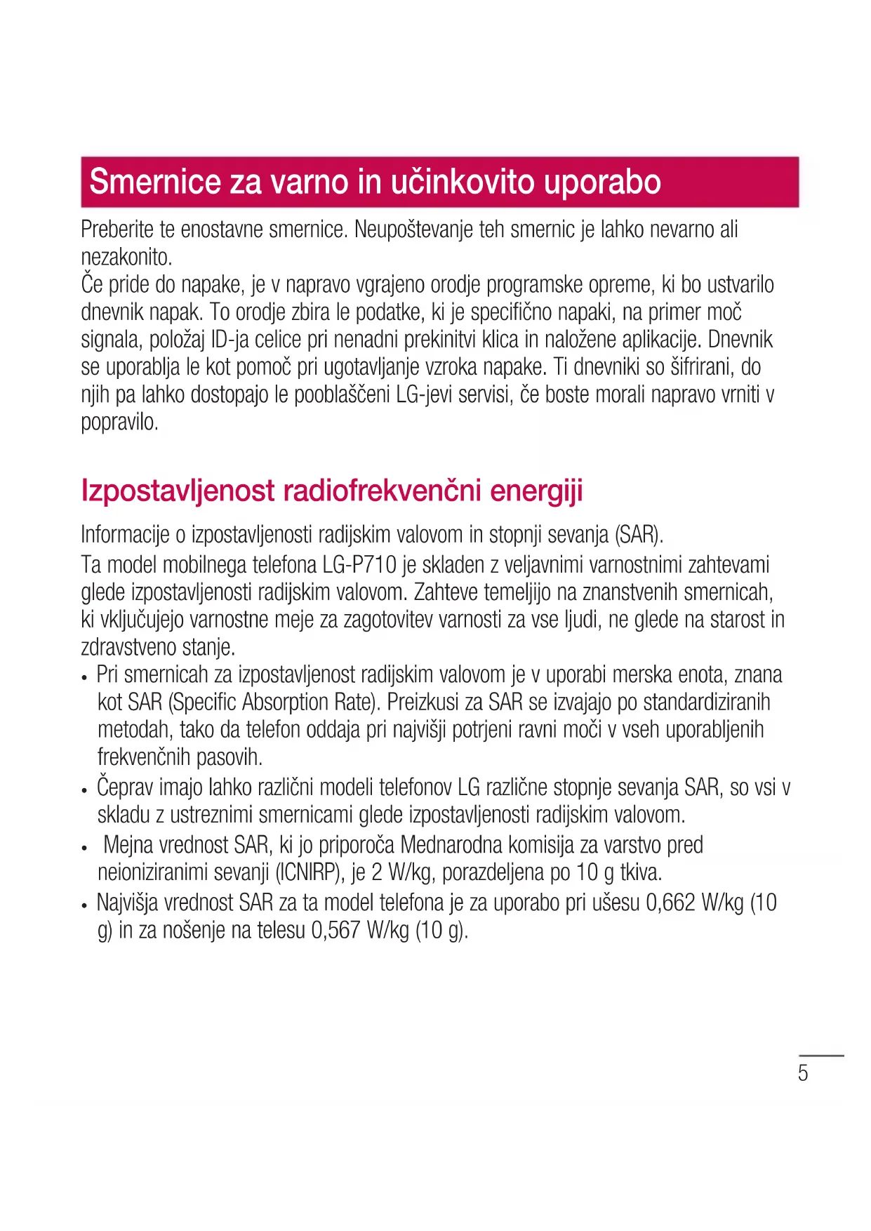 - Čeprav imajo lahko različni modeli telefonov LG različne stopnje sevanja SAR, so vsi v skladu z ustreznimi smernicami glede izpostavljenosti radijskim valovom.