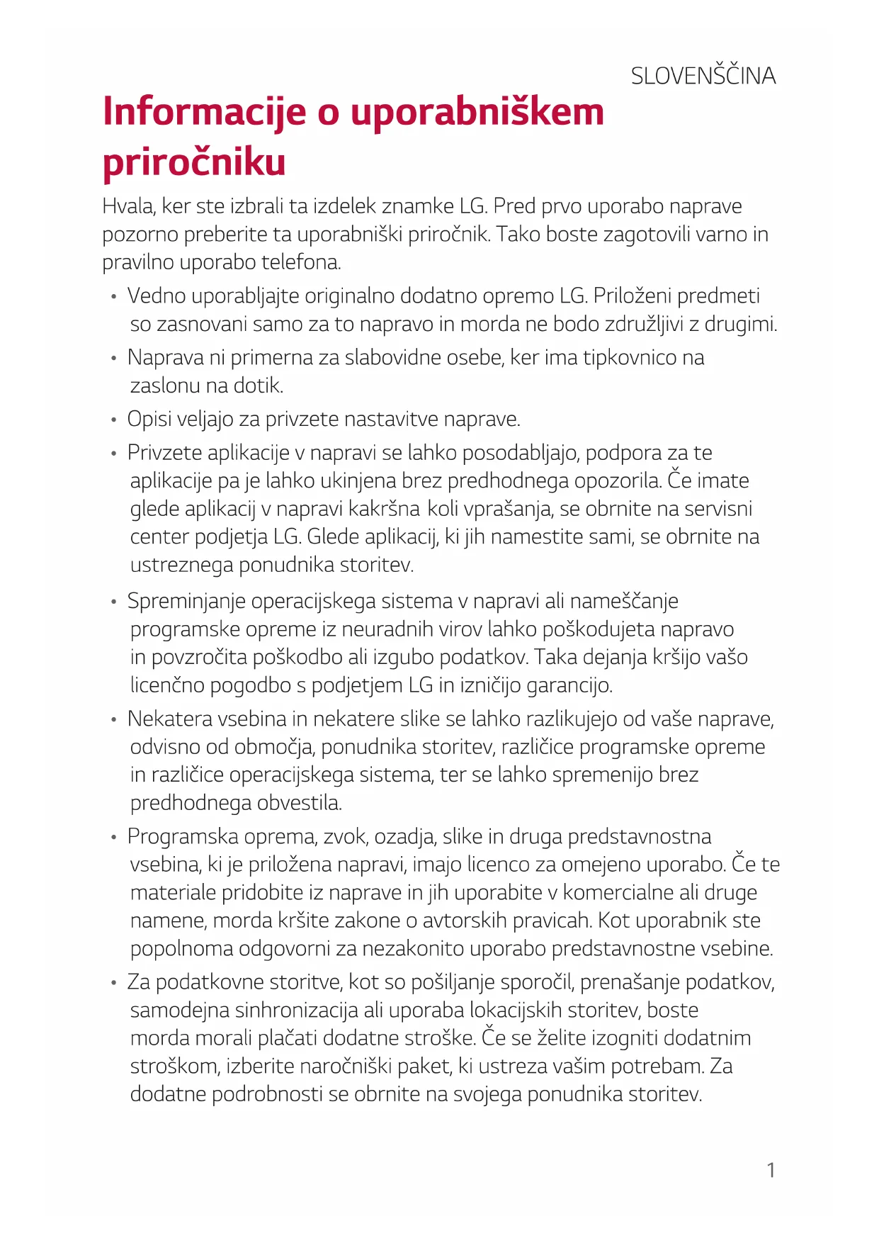 - Spreminjanje operacijskega sistema v napravi ali nameščanje programske opreme iz neuradnih virov lahko poškodujeta napravo in povzročita poškodbo ali izgubo podatkov. Taka dejanja kršijo vašo licenčno pogodbo s podjetjem LG in izničijo garancijo.