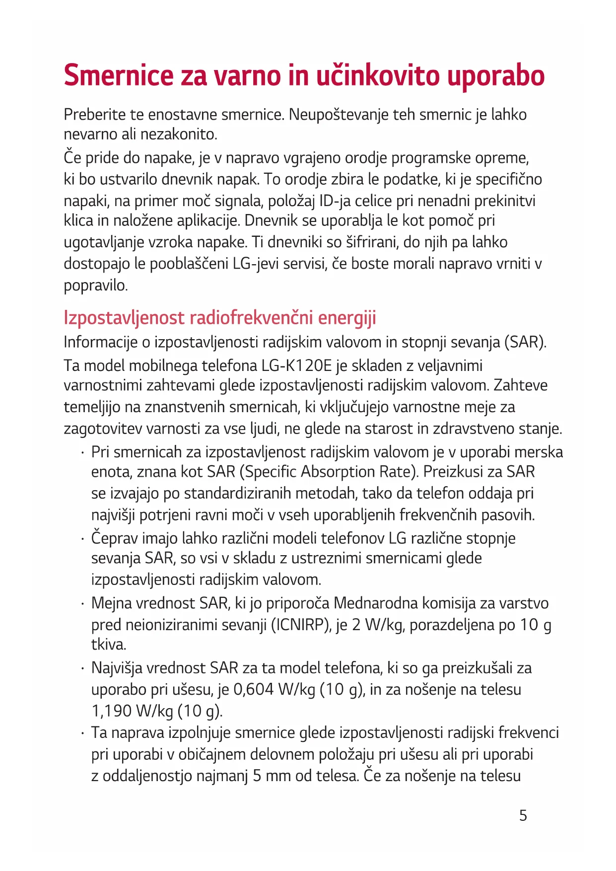 Za informacije o skladnosti izdelka se obrnite na pisarno: .......................................................................835 Smernice za varno in učinkovito uporabo Preberite te enostavne smernice. Neupoštevanje teh smernic je lahko nevarno ali nezakonito. Če pride do napake, je v napravo vgrajeno orodje programske opreme, ki bo ustvarilo dnevnik napak. To orodje zbira le podatke, ki je specifično napaki, na primer moč signala, položaj ID-ja celice pri nenadni prekinitvi klica in naložene aplikacije. Dnevnik se uporablja le kot pomoč pri ugotavljanje vzroka napake. Ti dnevniki so šifrirani, do njih pa lahko dostopajo le pooblaščeni LG-jevi servisi, če boste morali napravo vrniti v popravilo. Izpostavljenost radiofrekvenčni energiji Informacije o izpostavljenosti radijskim valovom in stopnji sevanja (SAR). Ta model mobilnega telefona LG-K120E je skladen z veljavnimi varnostnimi zahtevami glede izpostavljenosti radijskim valovom. Zahteve temeljijo na znanstvenih smernicah, ki vključujejo varnostne meje za zagotovitev varnosti za vse ljudi, ne glede na starost in zdravstveno stanje.