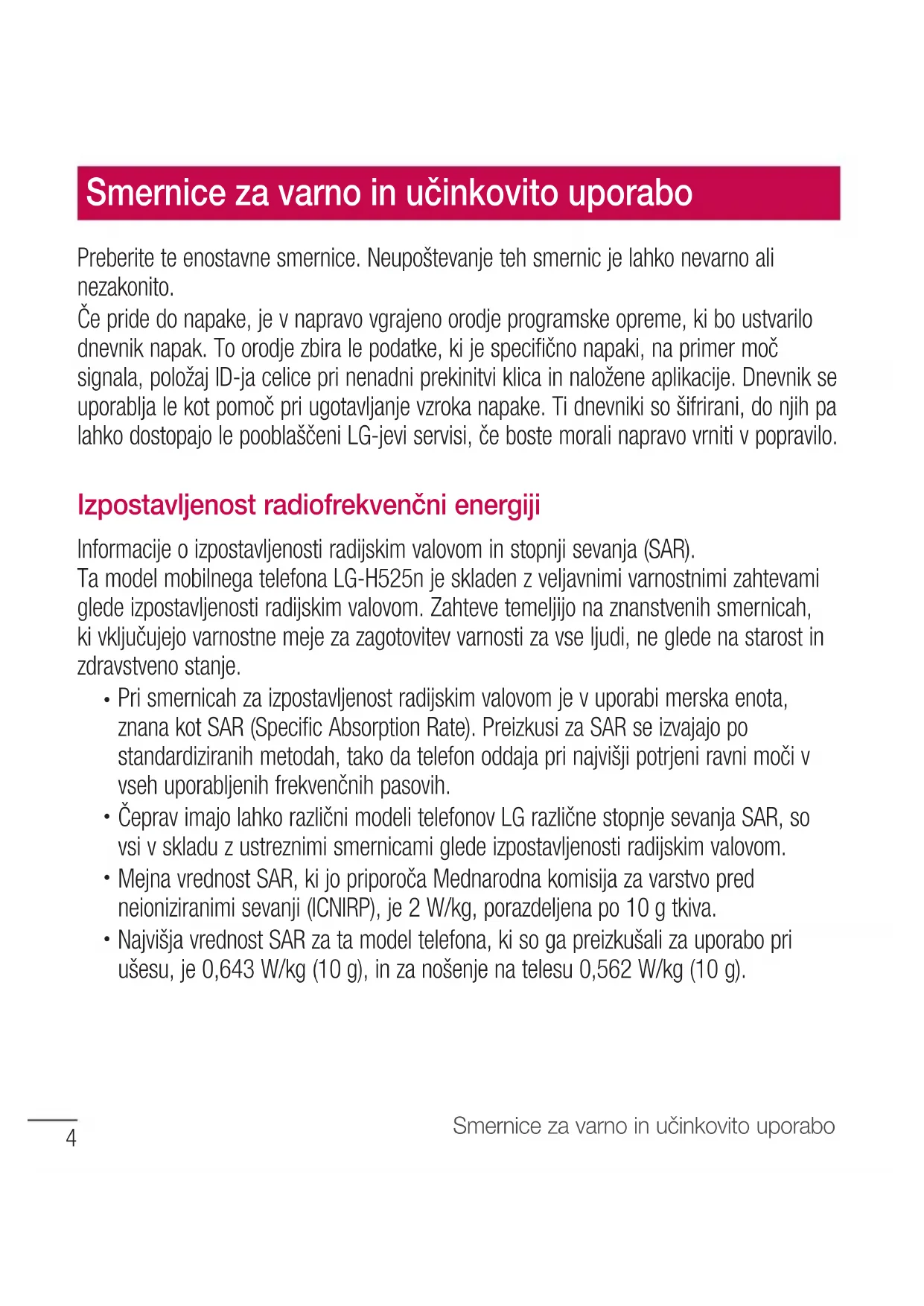 Čeprav imajo lahko različni modeli telefonov LG različne stopnje sevanja SAR, so vsi v skladu z ustreznimi smernicami glede izpostavljenosti radijskim valovom.
