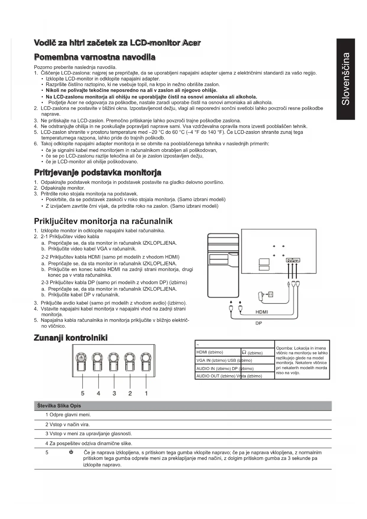 - Godišnja potrošnja energije izračunata je na temelju uobičajene potrošnje struje za 4 sata rada dnevno, 365 dana u godini.Slovenščina Vodič za hitri začetek za LCD-monitor Acer Pomembna varnostna navodila Pozorno preberite naslednja navodila. 1. Čiščenje LCD-zaslona: najprej se prepričajte, da se uporabljeni napajalni adapter ujema z električnimi standardi za vašo regijo.