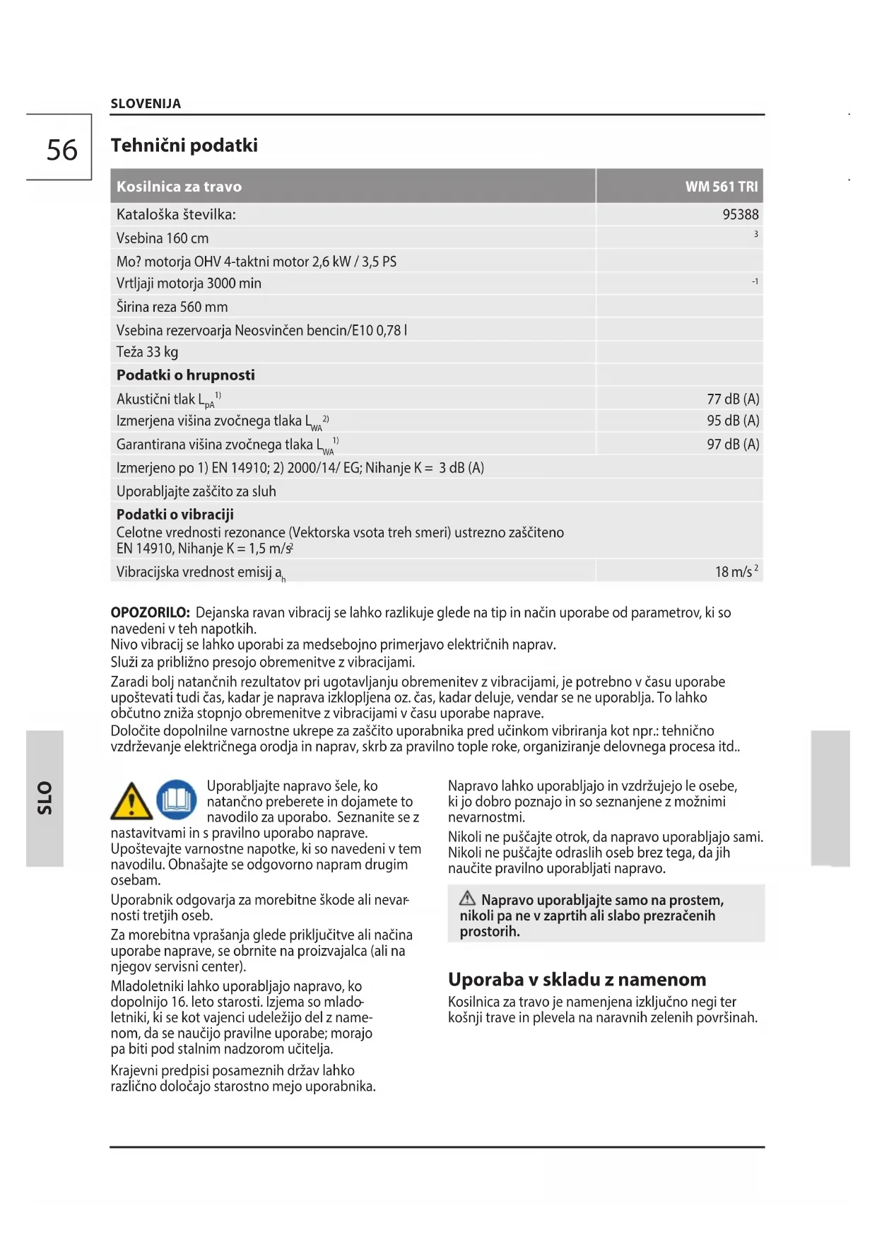 letniki, ki se kot vajenci udeležijo del z name- nom, da se naučijo pravilne uporabe; morajo pa biti pod stalnim nadzorom učitelja. Krajevni predpisi posameznih držav lahko različno določajo starostno mejo uporabnika. Napravo lahko uporabljajo in vzdržujejo le osebe, ki jo dobro poznajo in so seznanjene z možnimi nevarnostmi. Nikoli ne puščajte otrok, da napravo uporabljajo sami. Nikoli ne puščajte odraslih oseb brez tega, da jih naučite pravilno uporabljati napravo. Napravo uporabljajte samo na prostem, nikoli pa ne v zaprtih ali slabo prezračenih prostorih. Uporaba v skladu z namenom Kosilnica za travo je namenjena izključno negi ter košnji trave in plevela na naravnih zelenih površinah. SLOVENIJA57 SLO SLO SLOVENIJA OPOZORILO! Nevarnost poškodb Naprava se ne sme uporabljati za košnjo žive meje, trdih vej in lesa, ter niti za drobljenje materiala v kompost. Ne uporabljajte naprave za košnjo trave, ki ni na tleh, tj. npr. trave, ki raste na zidovih, skalah itd.. Napravo lahko uporabljate le vnaveden namen. Proizvajalec ne odgovarja za škode in posledice, ki bi nastale zaradi neupoštevanja splošno veljavnih predpisov in določil v tem navodilu za uporabo. Sekundarne nevarnosti Nevarnost poškodb Ravnajte previdno, da se ne poškodujete z orodjem. Povratni sunek lahko pripelje do smrtnih poškodb zaradi vreznin. Roke imejte vedno v varni razdalji od rezalne naprave, predvsem, kadar vključujete motor. Nikoli se z rokami ne dotikajte ohišja, kadar napra- va deluje. Nositi zaščitne rokavice Ko se ugasne se lahko rezalna glava vrti še nekaj sekund. Noge in roke stran – pazite na varno razdaljo. Odbiti kamni ali zemlja lahko povzročijo poškodbe. Pred košnjo preiščite površino, če niso prisotni tujki. Pri delu vedno uporabljajte zaščitna očala. Nevarnost opeklin! Določeni deli se pri delovanju zelo pregrevajo. Ne doti- kajte se vročih delov kot npr. motor, blažilnik hrupa itd.. Stik z vročimi deli stroja lahko povzroči opekline Počakajte najprej, da se naprave ohladijo. Nevarnost zastrupitve! Izpušni plini, gorivo in sredstva za mazanje so stru