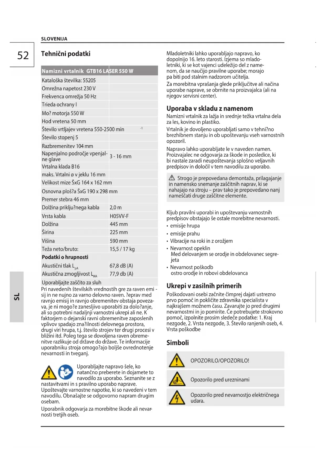 - Nevarnost poškodb ostro orodje in robovi obdelovanca Ukrepi v zasilnih primerih Poškodovani osebi začnite čimprej dajati ustrezno prvo pomoč in pokličite zdravnika specialista v najkrajšem možnem času. Zavarujte jo pred drugimi nevarnostmi in jo pomirite. Če potrebujete strokovno pomoč, izpolnite prosim sledeče podatke: 1. Kraj nezgode, 2. Vrsta nezgode, 3. Število ranjenih oseb, 4. Vrsta poškodbe Simboli OPOZORILO/OPOZORILO! Opozorilo pred urezninami Opozorilo pred nevarnostjo električnega udara.D