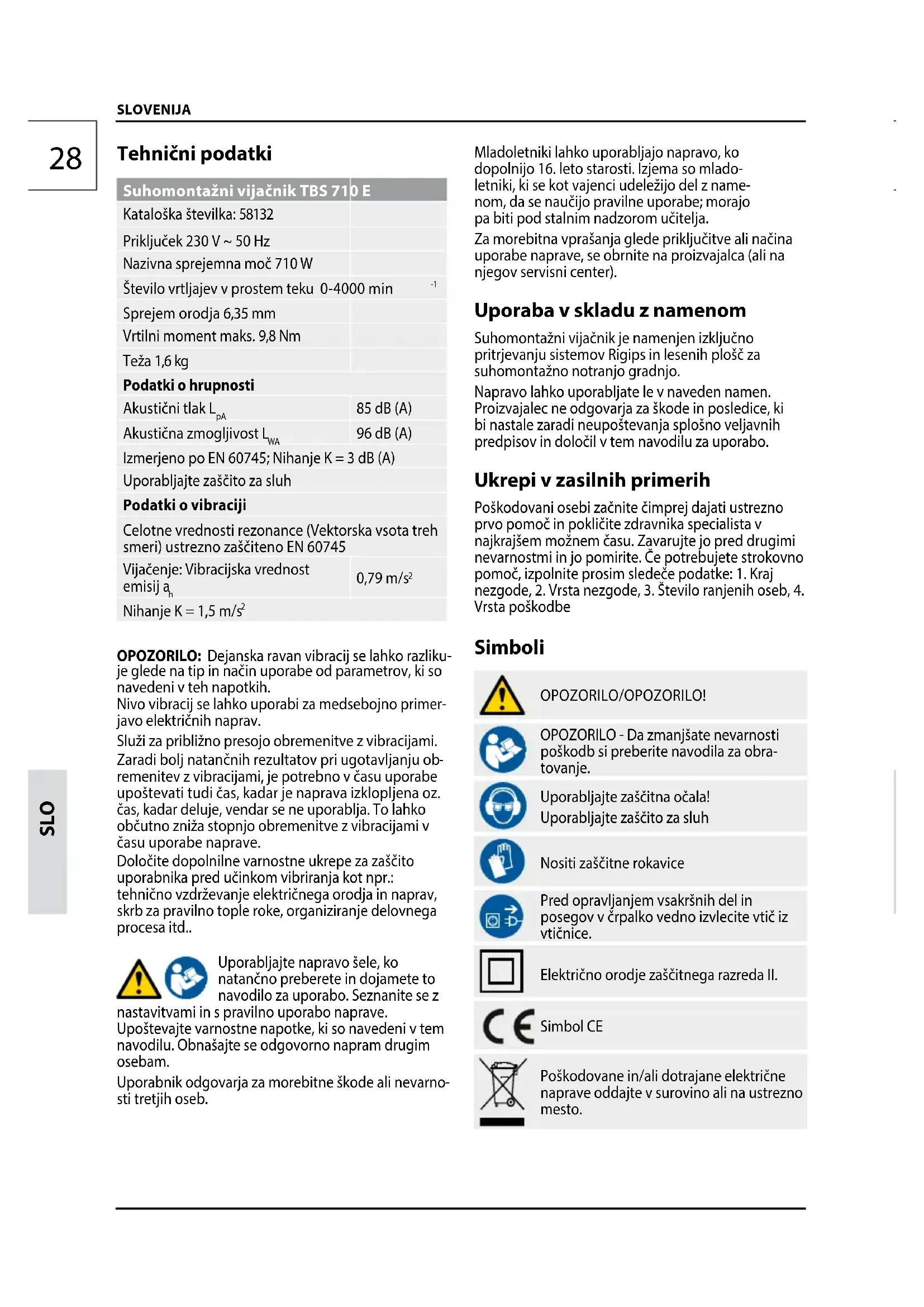 DSLO SLOVENIJA Mladoletniki lahko uporabljajo napravo, ko dopolnijo 16. leto starosti. Izjema so mlado- letniki, ki se kot vajenci udeležijo del z name- nom, da se naučijo pravilne uporabe; morajo pa biti pod stalnim nadzorom učitelja. Za morebitna vprašanja glede priključitve ali načina uporabe naprave, se obrnite na proizvajalca (ali na njegov servisni center). Uporaba v skladu z namenom Suhomontažni vijačnik je namenjen izključno pritrjevanju sistemov Rigips in lesenih plošč za suhomontažno notranjo gradnjo. Napravo lahko uporabljate le vnaveden namen. Proizvajalec ne odgovarja za škode in posledice, ki bi nastale zaradi neupoštevanja splošno veljavnih predpisov in določil v tem navodilu za uporabo. Ukrepi v zasilnih primerih Poškodovani osebi začnite čimprej dajati ustrezno prvo pomoč in pokličite zdravnika specialista v najkrajšem možnem času. Zavarujte jo pred drugimi nevarnostmi in jo pomirite. Če potrebujete strokovno pomoč, izpolnite prosim sledeče podatke: 1. Kraj nezgode, 2. Vrsta nezgode, 3. Število ranjenih oseb, 4. Vrsta poškodbe Simboli OPOZORILO/OPOZORILO! OPOZORILO - Da zmanjšate nevarnosti poškodb si preberite navodila za obra- tovanje. Uporabljajte zaščitna očala! Uporabljajte zaščito za sluh Nositi zaščitne rokavice Pred opravljanjem vsakršnih del in posegov v črpalko vedno izvlecite vtič iz vtičnice. Električno orodje zaščitnega razreda II. Simbol CE Poškodovane in/ali dotrajane električne naprave oddajte v surovino ali na ustrezno mesto. Tehnični podatki Suhomontažni vijačnik TBS 710 E Kataloška številka: 58132 Priključek 230 V ~ 50 Hz Nazivna sprejemna moč 710 W Število vrtljajev v prostem teku 0-4000 min