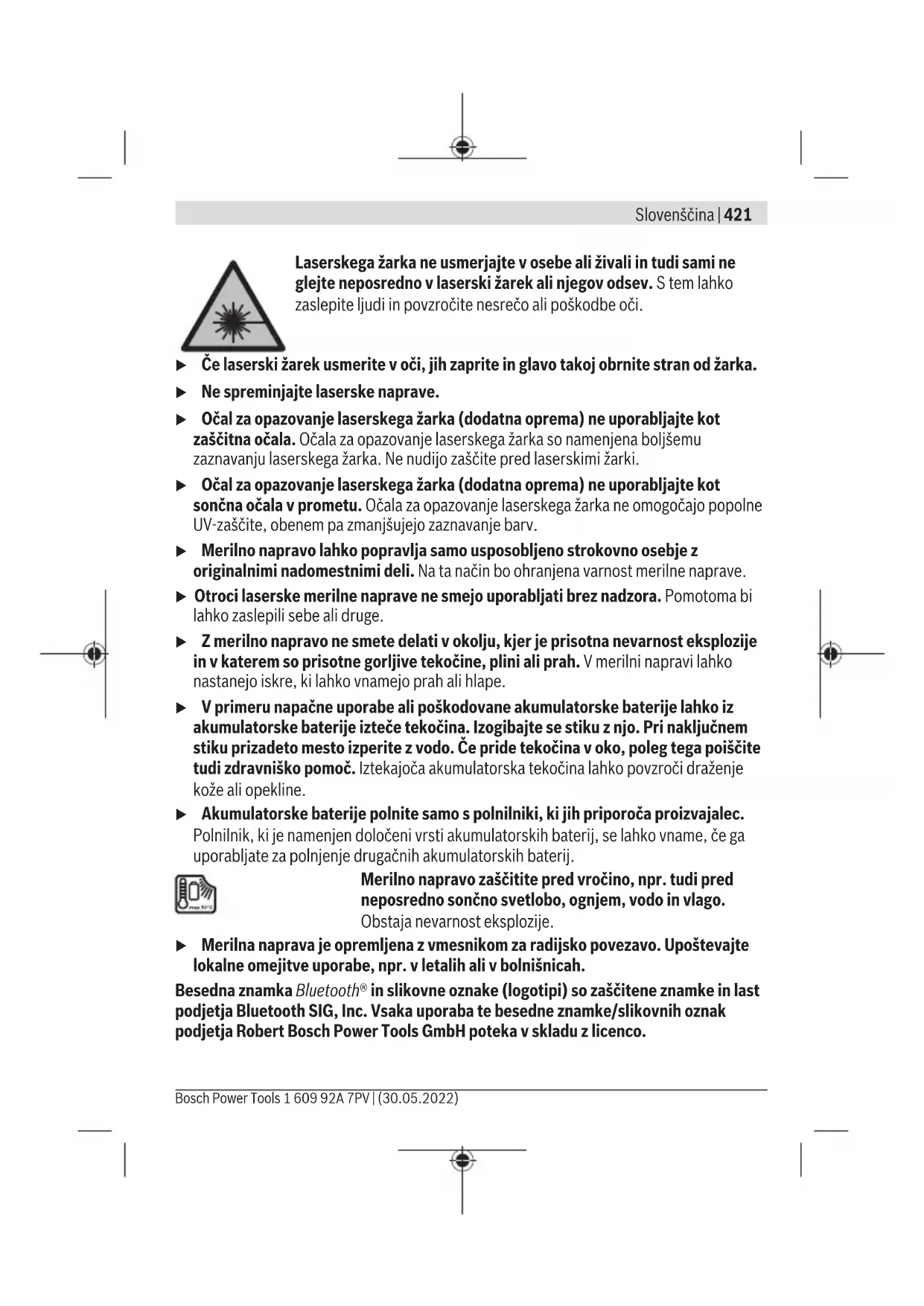 Polnjenje litij-ionske akumulatorske baterije u Za polnjenje uporabite napajalnik USB, pri katerem tehnični podatki (napetost in polnilni tok) ustrezajo podatkom priporočenega napajalnika. Pri tem upoštevajte Bosch Power Tools 1 609 92A 7PV | (30.05.2022)428 | Slovenščina navodila za uporabo napajalnika USB. Priporočen napajalnik: glejte tehnične podatke. u Bodite pozorni na omrežno napetost! Napetost vira električne energije se mora ujemati s podatki na omrežnem priključku električnega orodja. Omrežne priključke, ki so označeni z 230V, lahko priključite tudi na napetost 220V. Litij-ionske akumulatorske baterije se zaradi mednarodnih transportnih predpisov dobavljajo polovično napolnjene. Da zagotovite polno moč akumulatorske baterije, jo pred prvo uporabo popolnoma napolnite. Za dodatne informacije si oglejte spletna navodila za uporabo: www.bosch-pt.com/manuals Delovanje Uporaba u Vklopljene merilne naprave nikoli ne puščajte brez nadzora. Po uporabi jo izklopite. Laserski žarek lahko zaslepi druge osebe. u Merilno napravo zavarujte pred vlago in neposrednim sončnim sevanjem.u Merilne naprave ne izpostavljajte ekstremnim temperaturam ali temperaturnim nihanjem. Merilne naprave na primer ne puščajte dalj časa v avtomobilu. Počakajte, da se temperatura merilne naprave pri večjih temperaturnih nihanjih najprej prilagodi, šele nato napravo uporabite. Pri ekstremnih temperaturah ali temperaturnih nihanjih se lahko zmanjša natančnost delovanja merilne naprave. u Preprečite močne udarce v merilno napravo in padce na tla. Po močnih zunanjih vplivih na merilno napravo morate pred nadaljevanjem dela vedno izvesti preizkus natančnosti (glejte „Preizkus natančnosti“, Stran433). Vklop/izklop Pritisnite tipko , da vklopite merilno napravo in laser. Merilno napravo lahko vklopite tudi brez laserja tako, da pritisnete tipko . Za izklop merilne naprave pridržite tipko . Vrednosti in nastavitve naprave v pomnilniku se shranijo. Kamera Pritisnite tipko / , da vklopite ali izklopite kamero. 1 609 92A 7PV | (30.05.2022) Bosch Power ToolsSlovenščina | 429 Ko izklopite merilno napravo, ostane izbrano stanje shranjeno. Pri merjenju večjih razdalj (pribl. > 5m) se prikaže tudi ciljna oznaka za označevanje merilne točke. Za dodatne informacije si oglejte spletna navodila za uporabo: www.bosch-pt.com/manuals Merjenje Ob vklopu je merilna naprava samodejno nastavljena na merjenje dolžine. Referenčna raven za merjenje po vklopu je zadnji rob merilne naprave. Spremenite lahko tudi referenčno raven. (glejte „Izbira referenčne ravni“, Stran429) Postavite merilno napravo na želeno izhodiščno merilno mesto (npr. ob steno). Pritisnite tipko , da sprožite meritev. Po merilnem postopku se laserski žarek izključi. Za novo meritev ponovite ta postopek. Izmerjene vrednosti ali končne rezultate je mogoče seštevati in odštevati. Če je vklopljen neprekinjen laserski žarek in funkcija neprekinjenega merjenja se začne merjenje že po prvem pritisku tipke . Vklopljen neprekinjen laserski žarek se po meritvi ne izklopiNeprekinjen laserski žarek. Za dodatne informacije si oglejte spletna navodila za uporabo: www.bosch-pt.com/manuals Merilne naprave se med merjenjem ne sme premikati. Zaradi tega je treba merilno napravo fiksno postaviti na trden naslon ali površino. Sprejemna leča(20), izhodna odprtina laserskega žarčenja(21) in kamera(22) med merjenjem ne smejo biti prekrite. Izbira referenčne ravni Pri merjenju lahko izbirate med različnimi referenčnimi ravnmi: zadnji rob merilne naprave (npr. pri naleganju na stene) ost za razpiranje prislonske plošče v razponu 180° (npr. za merjenje iz vogalov) Bosch Power Tools 1 609 92A 7PV | (30.05.2022)430 | Slovenščina sprednji rob merilne naprave (npr. pri merjenju od roba mize) sredina navoja stojala(19) (npr. za meritve s stojalom) Za dodatne informacije si oglejte spletna navodila za uporabo: www.bosch-pt.com/manuals Meni osnovnih nastavitev V meniju osnovne nastavitve najdete naslednje osnovne nastavitve: – Vklop/izklop funkcije Bluetooth® – Menjava referenčne ravni(glejte „Izbira referenčne ravni“, Stran429) – Funkcija časovnika – Vklop/izklop neprekinjenega laserskega žarka – Umerjanje naklona(glejte „Preizkus natančnosti“, Stran433) – Umerjanje ciljnega prikaza – Brisanje pomnilnika (GLM 150-27 C) – Nastavitev jezika – Nastavitev datuma in časa – Spreminjanje merske enote – Spreminjanje kotne enote – Aktivacija aplikacije PRO360 – Priklic informacij o napravi – Vklop/izklop zvočnih signalov – Nastavitev časa izklopa – Nastavitev časa zatemnitve – Nastavitev svetlosti zaslona – Vklop/izklop samodejnega vrtenja zaslona 1 609 92A 7PV | (30.05.2022) Bosch Power ToolsSlovenščina | 431 Kratko pritisnite tipko ali držite tipko , da odprete meni Osnovne nastavitve
