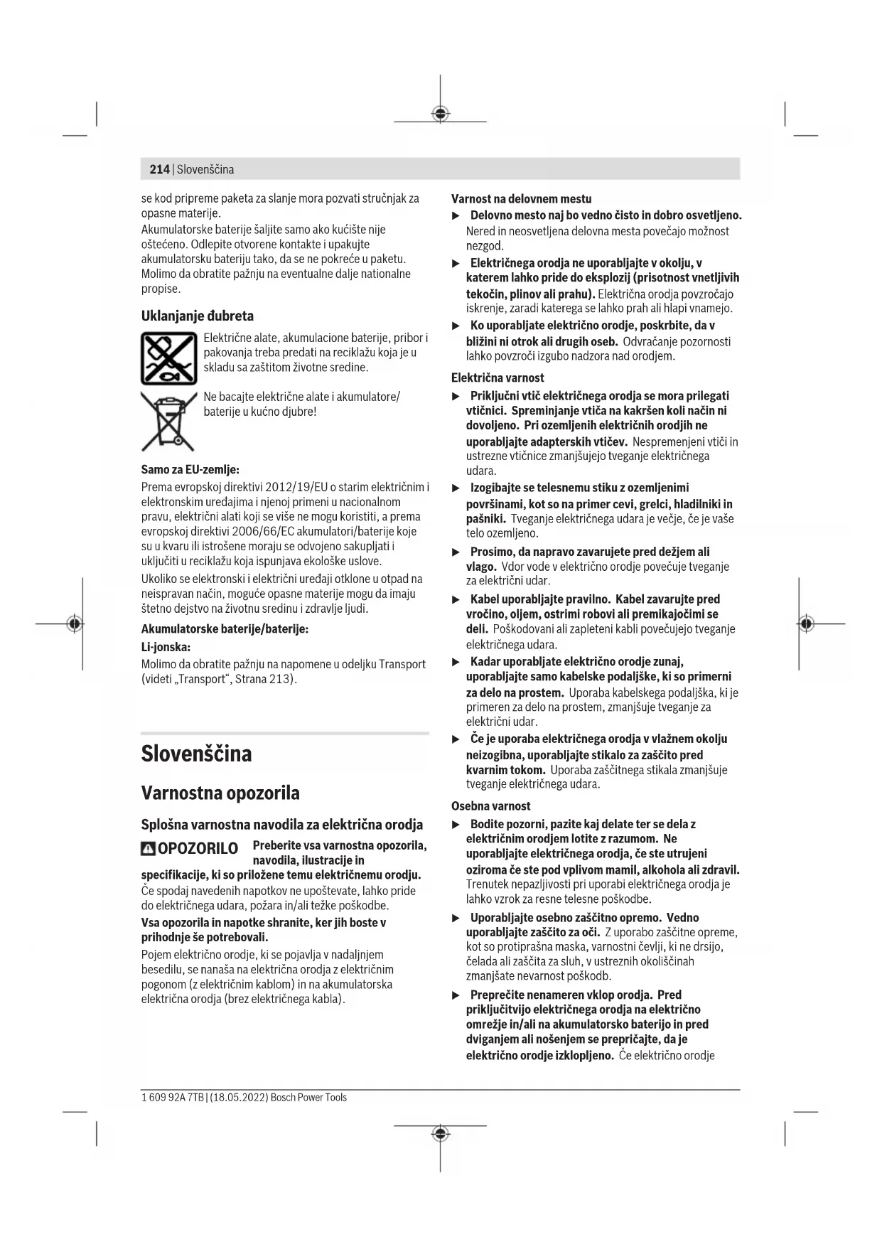 Oznaka reza 0° (12) prikazuje položaj lista testere kod pravougaonog reza. Oznaka reza 45° (13) prikazuje položaj lista testere kod reza pod uglom od 45°. Za rez tačno po meri stavite kružnu testeru kao što pokazuje slika na radni komad. Izvedite najbolje jedan probni rez. Puštanje u rad Ubacivanje akumulatora Napunjen akumulator (3) gurnite u električni alat sve dok nije sigurno zaključan. 1 609 92A 7TB | (18.05.2022) Bosch Power ToolsSrpski | 213 Uključivanje/isključivanje Za puštanje u rad električnog alata aktivirajte prvo blokadu uključivanja (1) i pritisnite zatim prekidač za uključivanje/ isključivanje (2) i držite ga pritisnutim. Da biste isključili električni alat, pustite prekidač za uključivanje/isključivanje (2). Napomena: Iz bezbednosnih razloga prekidač za uključivanje/isključivanje (2) se ne može blokirati, nego mora stalno da bude pritisnut tokom rada. Zaštita od dubinskog pražnjenja Litijum-jonski akumulator je zaštićen od dubinskog pražnjenja zahvaljujući funkciji „Electronic Cell Protection“ (ECP). Ako se akumulator isprazni, električni alat se isključuje zahvaljujući zaštitnom prekidaču. Umetnuti alat se više ne pokreće. Uputstva za rad u Izvadite bateriju pre svih radova na električnom alatu (na primer održavanja, promene pribora itd.) kao i kod njegovog transporta i čuvanja. Kod slučajnog aktiviranja prekidača za uključivanje/isključivanje postoji opasnost od povrede. Širina rezanja varira u zavisnosti od lista testere koji se koristi. Zaštitite listove testere od preloma i udaraca. Električni alat vodite ravnomerno i sa laganim potiskom u smeru sečenja. Prejak potisak znatno smanjuje vek trajanja umetnih alata i može da ošteti električni alat. Učinak testerisanja i kvalitet reza znatno zavise od stanja i oblika zuba lista testere. Upotrebljavajte stoga samo oštre i listove testere predviđene za materijal koji se obrađuje. Sečenje drveta Pravi izbor lista testere upravlja se prema vrsti drveta, kvalitetu drveta i da li se zahtevaju uzdužan ili poprečan rez. Kod uzdužnog reza smreke nastaju dugi, spiralni opiljci. Prašina od bukovog ili hrastovog drveta je naročito opasna po zdravlje, radite stoga isključivo uz usisavanje prašine. Testerisanje sa paralelnim graničnikom (videti slikuD) Paralelni graničnik (10) omogućuje precizne rezove duž ivice radnog komada odnosno sečenje podjednakih traka. Gurnite vodeću polugu paralelnog graničnika (10) kroz vođicu u osnovnu ploču (8). Pričvrstite paralelni graničnik (10) pomoću leptir zavrtnja (15). Sečenje sa pomoćnim graničnikom (pogledajteslikuE) Za obradu većih radnih komada ili za sečenje pravih ivica možete pričvrstiti neku dasku ili letvu kao pomoćni graničnik na radni komad i voditi po dužini kružnu testeru sa osnovnom pločom na pomoćnom graničniku. Uputstva za optimalno ophodjenje sa akumulatorom Zaštitite akumulator od vlade i vode. Lagerujte akumulator samo u području temperature od −20°C do 50°C. Ne ostavljajte akumulator leti npr. u autu. Čistite povremeno proreze za ventilaciju akumulatora sa mekom, čistom i suvom četkicom. Bitno skraćeno vreme rada posle punjenja pokazuje da je akumulator istrošen i da se mora zameniti. Obratite pažnju na uputstva za uklanjanje otpada. Održavanje i servis Održavanje i čišćenje u Izvadite bateriju pre svih radova na električnom alatu (na primer održavanja, promene pribora itd.) kao i kod njegovog transporta i čuvanja. Kod slučajnog aktiviranja prekidača za uključivanje/isključivanje postoji opasnost od povrede. u Držite električni alat i proreze za ventilaciju čiste, da bi dobro i sigurno radili. Klateća zaštitna hauba se mora uvek slobodno pokretati i automatski zatvarati. Držite zato područje oko oscilatorne zaštitne haube uvek čisto. Uklanjajte prašinu i piljevinu četkicom. Nepresvučene listove testere od nastanka korozije možete da zaštitite tankim slojem ulja bez kiseline. Uklonite pre sečenja ponovo ulje, jer će drvo biti zaprljano. Ostaci smole ili lepka na listu testere utiče na kvalitet reza. Čistite iz tog razloga listove testere odmah posle upotrebe. Servis i saveti za upotrebu Servis odgovara na vaša pitanja u vezi sa popravkom i održavanjem vašeg proizvoda kao i u vezi sa rezervnim delovima. Šematske prikaze i informacije u vezi rezervnih delova naći ćete i pod: www.bosch-pt.com Bosch tim za konsultacije vam rado pomaže tokom primene, ukoliko imate pitanja o našim proizvodima i njihovom priboru. Molimo da kod svih pitanja i naručivanja rezervnih delova neizostavno navedete broj artikla sa 10brojčanih mesta prema tipskoj pločici proizvoda. Srpski Bosch Elektroservis Dimitrija Tucovića 59 11000 Beograd Tel.: +381 11 644 8546 Tel.: +381 11 744 3122 Tel.: +381 11 641 6291 Fax: +381 11 641 6293 E-Mail: office@servis-bosch.rs www.bosch-pt.rs Dodatne adrese servisa pogledajte na: www.bosch-pt.com/serviceaddresses Transport Preporučeni litijum-jonski akumulatori podležu zahtevima propisa o opasnim materijama. Korisnik može bez dodatnih uslova transportovati akumulatore na drumu. Kod slanja preko trećih lica (na primer vazdušnih transportom ili špedicijom) mora se obratiti pažnja na posebne zahteve u pogledu pakovanja i označavanja. Tada Bosch Power Tools 1 609 92A 7TB | (18.05.2022)214 | Slovenščina se kod pripreme paketa za slanje mora pozvati stručnjak za opasne materije. Akumulatorske baterije šaljite samo ako kućište nije oštećeno. Odlepite otvorene kontakte i upakujte akumulatorsku bateriju tako, da se ne pokreće u paketu. Molimo da obratite pažnju na eventualne dalje nationalne propise. Uklanjanje đubreta Električne alate, akumulacione baterije, pribor i pakovanja treba predati na reciklažu koja je u skladu sa zaštitom životne sredine. Ne bacajte električne alate i akumulatore/ baterije u kućno djubre! Samo za EU‑zemlje: Prema evropskoj direktivi 2012/19/EU o starim električnim i elektronskim u
