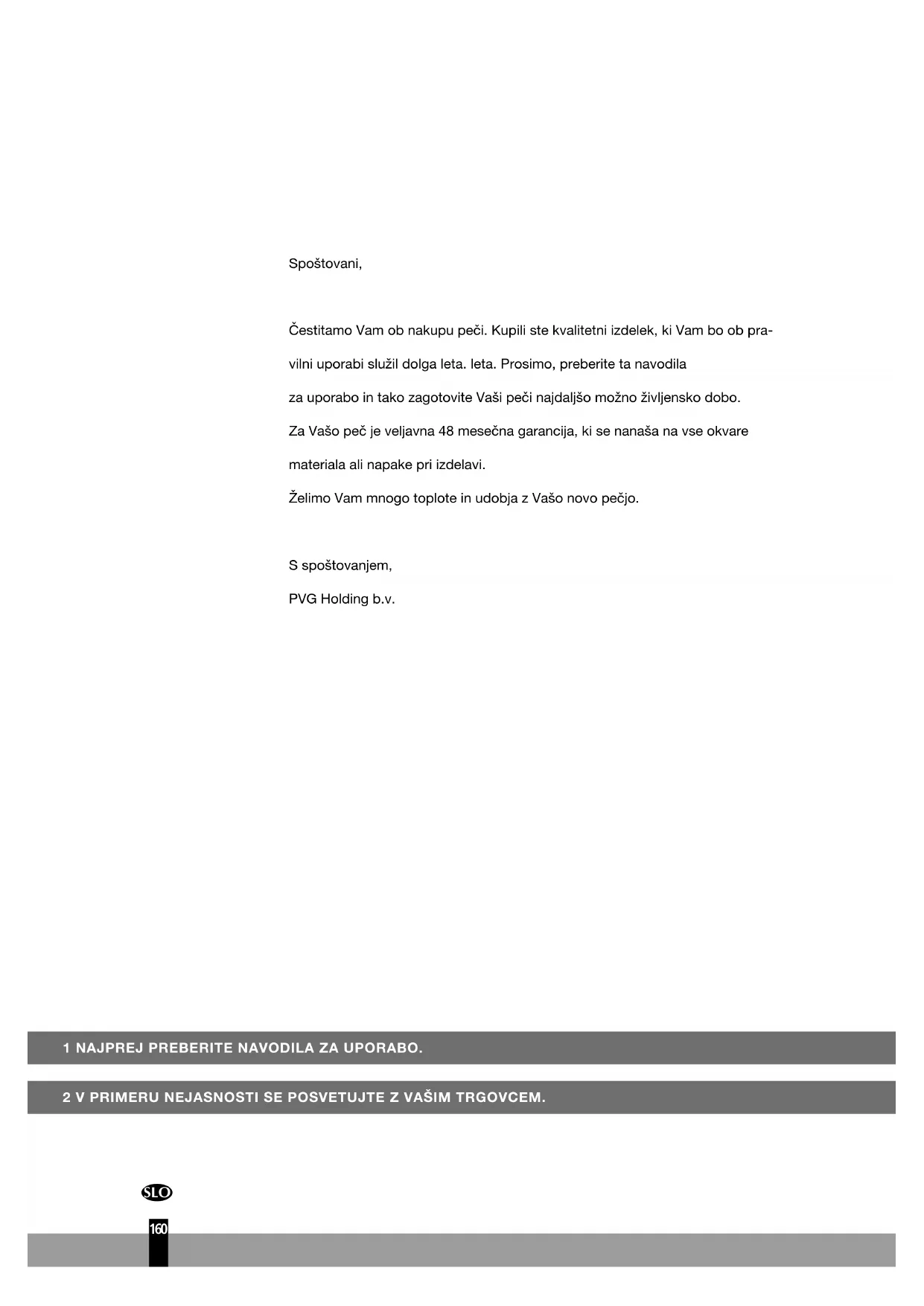 23Spoštovani, Čestitamo Vam ob nakupu peči. Kupili ste kvalitetni izdelek, ki Vam bo ob pra- vilni uporabi služil dolga leta. leta. Prosimo, preberite ta navodila za uporabo in tako zagotovite Vaši peči najdaljšo možno življensko dobo. Za Vašo peč je veljavna 48 mesečna garancija, ki se nanaša na vse okvare materiala ali napake pri izdelavi. Želimo Vam mnogo toplote in udobja z Vašo novo pečjo. S spoštovanjem, PVG Holding b.v. 1 NAJPREJ PREBERITE NAVODILA ZA UPORABO. 2 V PRIMERU NEJASNOSTI SE POSVETUJTE Z VAŠIM TRGOVCEM.