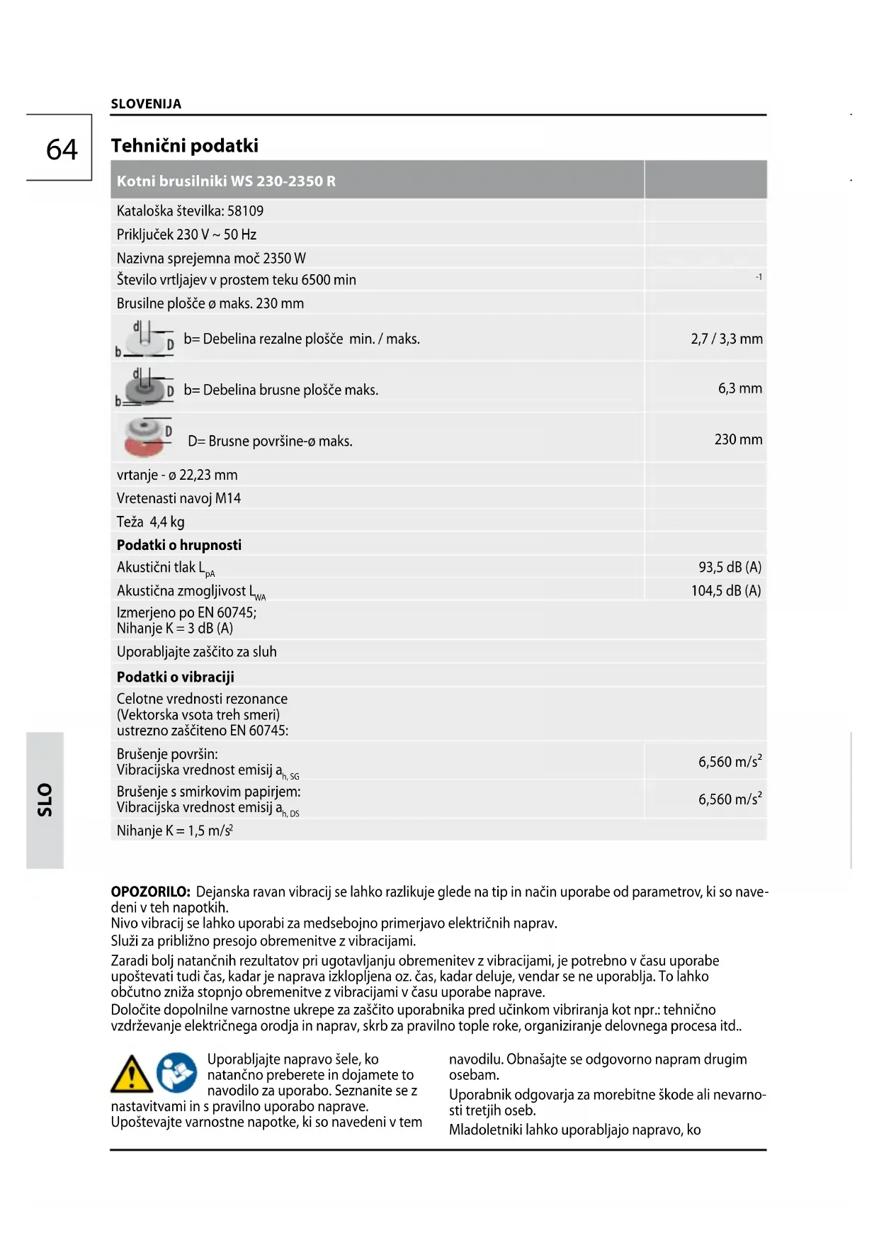 SLO SLOVENIJA Tehnični podatki Kotni brusilniki WS 230-2350 R Kataloška številka: 58109 Priključek 230 V ~ 50 Hz Nazivna sprejemna moč 2350 W Število vrtljajev v prostem teku 6500 min