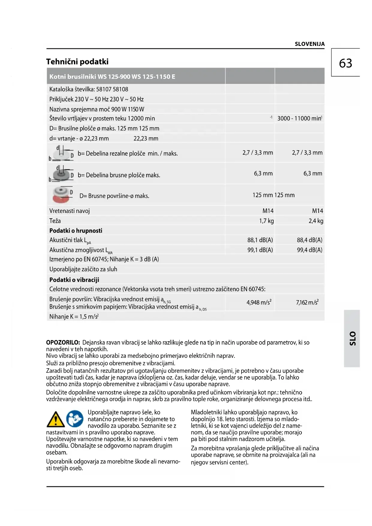 SLO SLOVENIJA Tehnični podatki Kotni brusilniki WS 125-900 WS 125-1150 E Kataloška številka: 58107 58108 Priključek 230 V ~ 50 Hz 230 V ~ 50 Hz Nazivna sprejemna moč 900 W 1150 W Število vrtljajev v prostem teku 12000 min