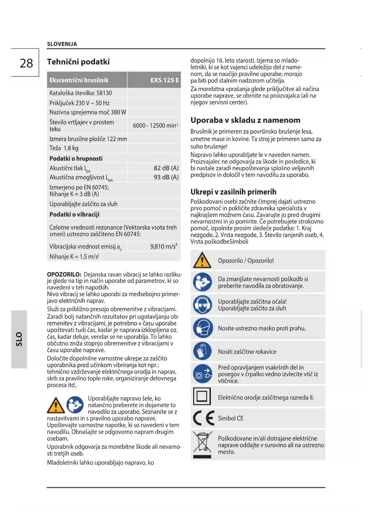SLO SLOVENIJA Tehnični podatki Ekscentrični brusilnik EXS 125 E Kataloška številka: 58130 Priključek 230 V ~ 50 Hz Nazivna sprejemna moč 380 W Število vrtljajev v prostem teku 6000 - 12500 min