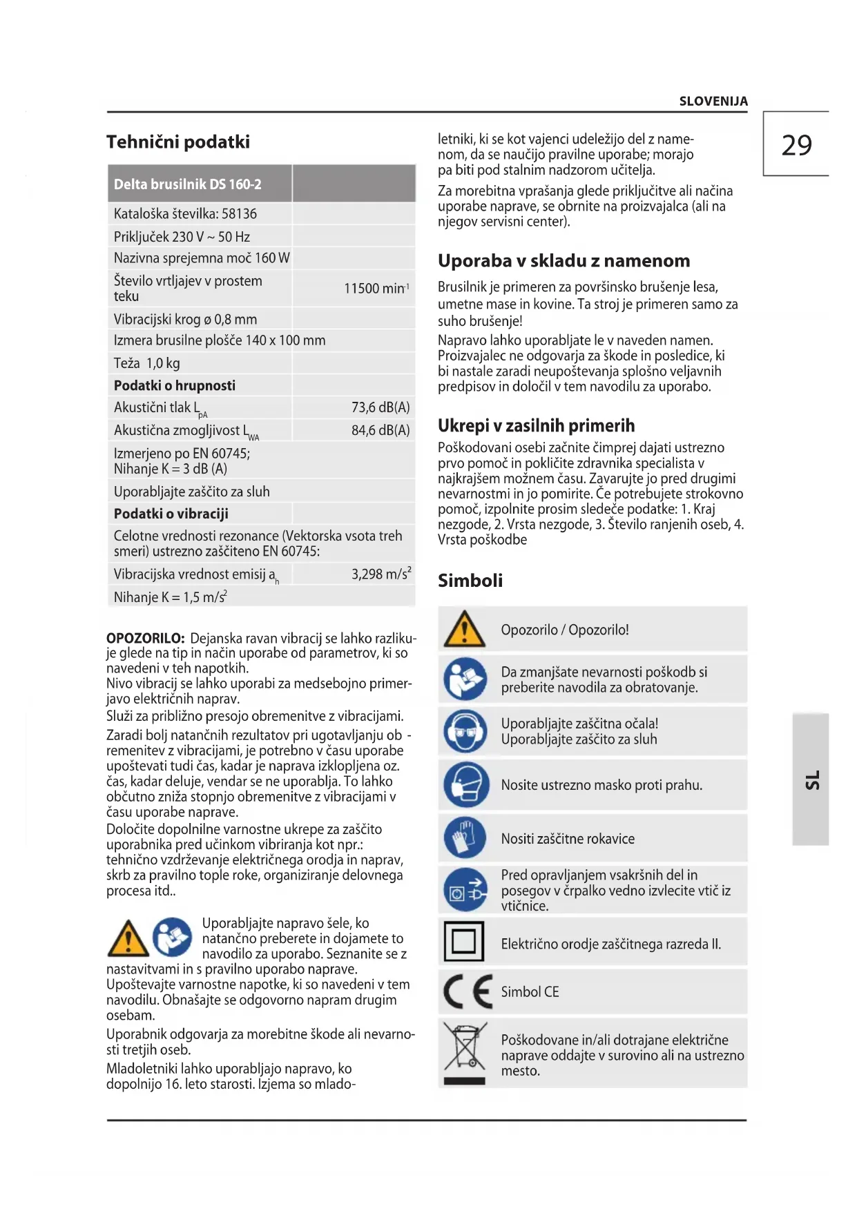 SLOVENIJA Tehnični podatki Delta brusilnik DS 160-2 Kataloška številka: 58136 Priključek 230 V ~ 50 Hz Nazivna sprejemna moč 160 W Število vrtljajev v prostem teku 11500 min