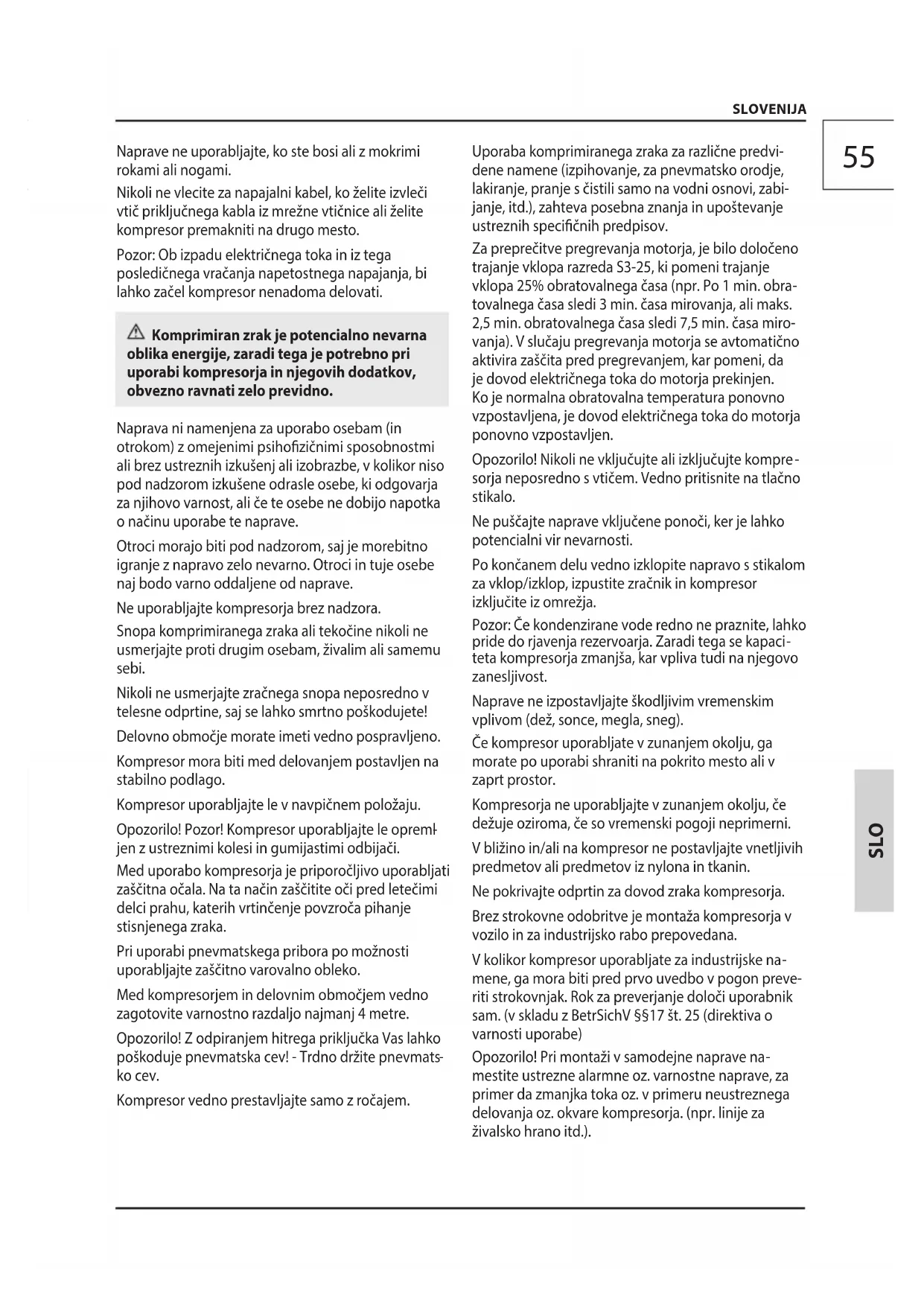 mestite ustrezne alarmne oz. varnostne naprave, za primer da zmanjka toka oz. v primeru neustreznega delovanja oz. okvare kompresorja. (npr. linije za živalsko hrano itd.). Naprave ne uporabljajte, ko ste bosi ali z mokrimi rokami ali nogami. Nikoli ne vlecite za napajalni kabel, ko želite izvleči vtič priključnega kabla iz mrežne vtičnice ali želite kompresor premakniti na drugo mesto. Pozor: Ob izpadu električnega toka in iz tega posledičnega vračanja napetostnega napajanja, bi lahko začel kompresor nenadoma delovati. Komprimiran zrak je potencialno nevarna oblika energije, zaradi tega je potrebno pri uporabi kompresorja in njegovih dodatkov, obvezno ravnati zelo previdno. Naprava ni namenjena za uporabo osebam (in otrokom) z omejenimi psihozičnimi sposobnostmi ali brez ustreznih izkušenj ali izobrazbe, v kolikor niso pod nadzorom izkušene odrasle osebe, ki odgovarja za njihovo varnost, ali če te osebe ne dobijo napotka o načinu uporabe te naprave. Otroci morajo biti pod nadzorom, saj je morebitno igranje z napravo zelo nevarno. Otroci in tuje osebe naj bodo varno oddaljene od naprave. Ne uporabljajte kompresorja brez nadzora. Snopa komprimiranega zraka ali tekočine nikoli ne usmerjajte proti drugim osebam, živalim ali samemu sebi. Nikoli ne usmerjajte zračnega snopa neposredno v telesne odprtine, saj se lahko smrtno poškodujete! Delovno območje morate imeti vedno pospravljeno. Kompresor mora biti med delovanjem postavljen na stabilno podlago. Kompresor uporabljajte le v navpičnem položaju. Opozorilo! Pozor! Kompresor uporabljajte le opreml