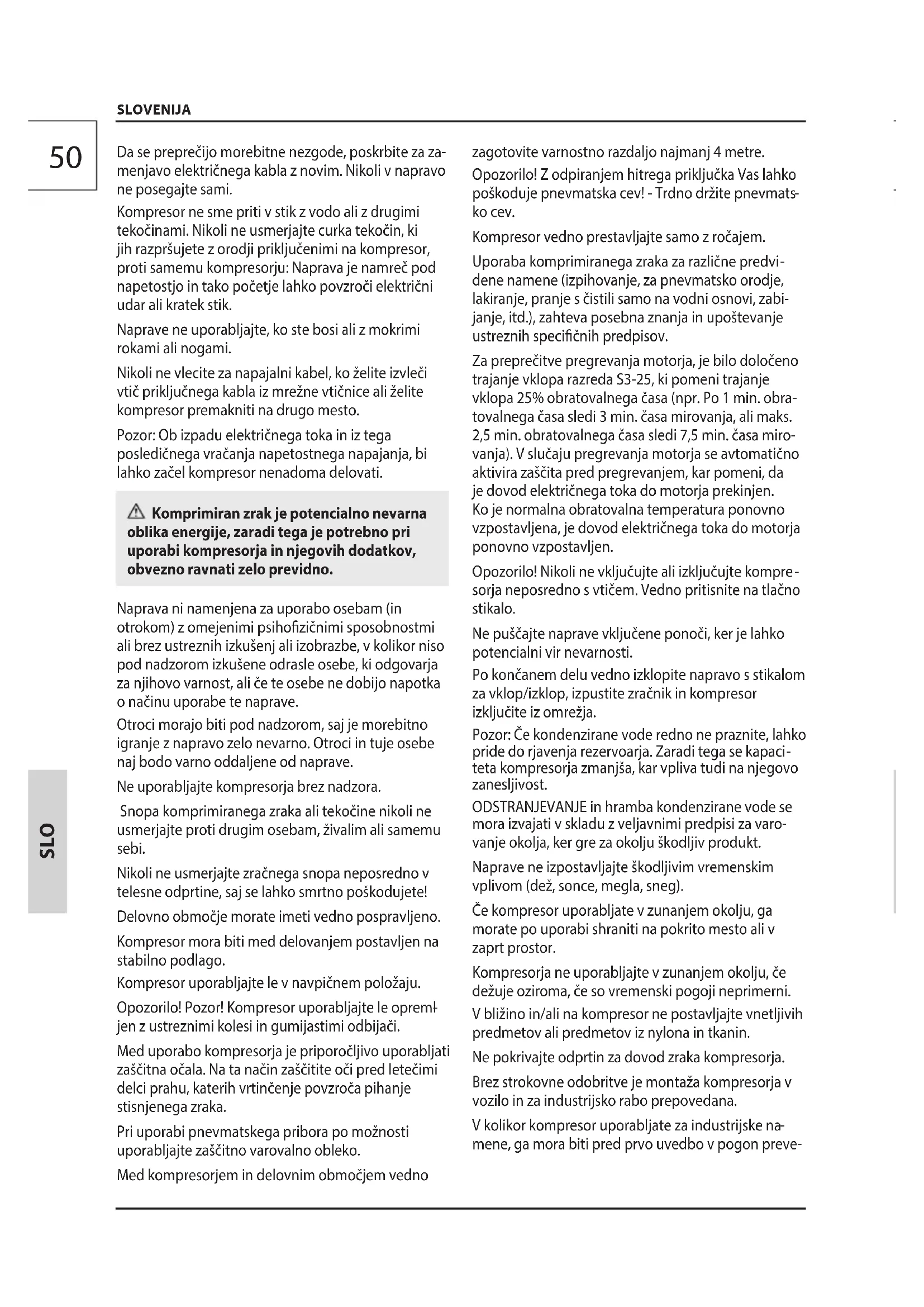 SLO Da se preprečijo morebitne nezgode, poskrbite za za- menjavo električnega kabla z novim. Nikoli v napravo ne posegajte sami. Kompresor ne sme priti v stik z vodo ali z drugimi tekočinami. Nikoli ne usmerjajte curka tekočin, ki jih razpršujete z orodji priključenimi na kompresor, proti samemu kompresorju: Naprava je namreč pod napetostjo in tako početje lahko povzroči električni udar ali kratek stik. Naprave ne uporabljajte, ko ste bosi ali z mokrimi rokami ali nogami. Nikoli ne vlecite za napajalni kabel, ko želite izvleči vtič priključnega kabla iz mrežne vtičnice ali želite kompresor premakniti na drugo mesto. Pozor: Ob izpadu električnega toka in iz tega posledičnega vračanja napetostnega napajanja, bi lahko začel kompresor nenadoma delovati. Komprimiran zrak je potencialno nevarna oblika energije, zaradi tega je potrebno pri uporabi kompresorja in njegovih dodatkov, obvezno ravnati zelo previdno. Naprava ni namenjena za uporabo osebam (in otrokom) z omejenimi psihozičnimi sposobnostmi ali brez ustreznih izkušenj ali izobrazbe, v kolikor niso pod nadzorom izkušene odrasle osebe, ki odgovarja za njihovo varnost, ali če te osebe ne dobijo napotka o načinu uporabe te naprave. Otroci morajo biti pod nadzorom, saj je morebitno igranje z napravo zelo nevarno. Otroci in tuje osebe naj bodo varno oddaljene od naprave. Ne uporabljajte kompresorja brez nadzora. Snopa komprimiranega zraka ali tekočine nikoli ne usmerjajte proti drugim osebam, živalim ali samemu sebi. Nikoli ne usmerjajte zračnega snopa neposredno v telesne odprtine, saj se lahko smrtno poškodujete! Delovno območje morate imeti vedno pospravljeno. Kompresor mora biti med delovanjem postavljen na stabilno podlago. Kompresor uporabljajte le v navpičnem položaju. Opozorilo! Pozor! Kompresor uporabljajte le opreml