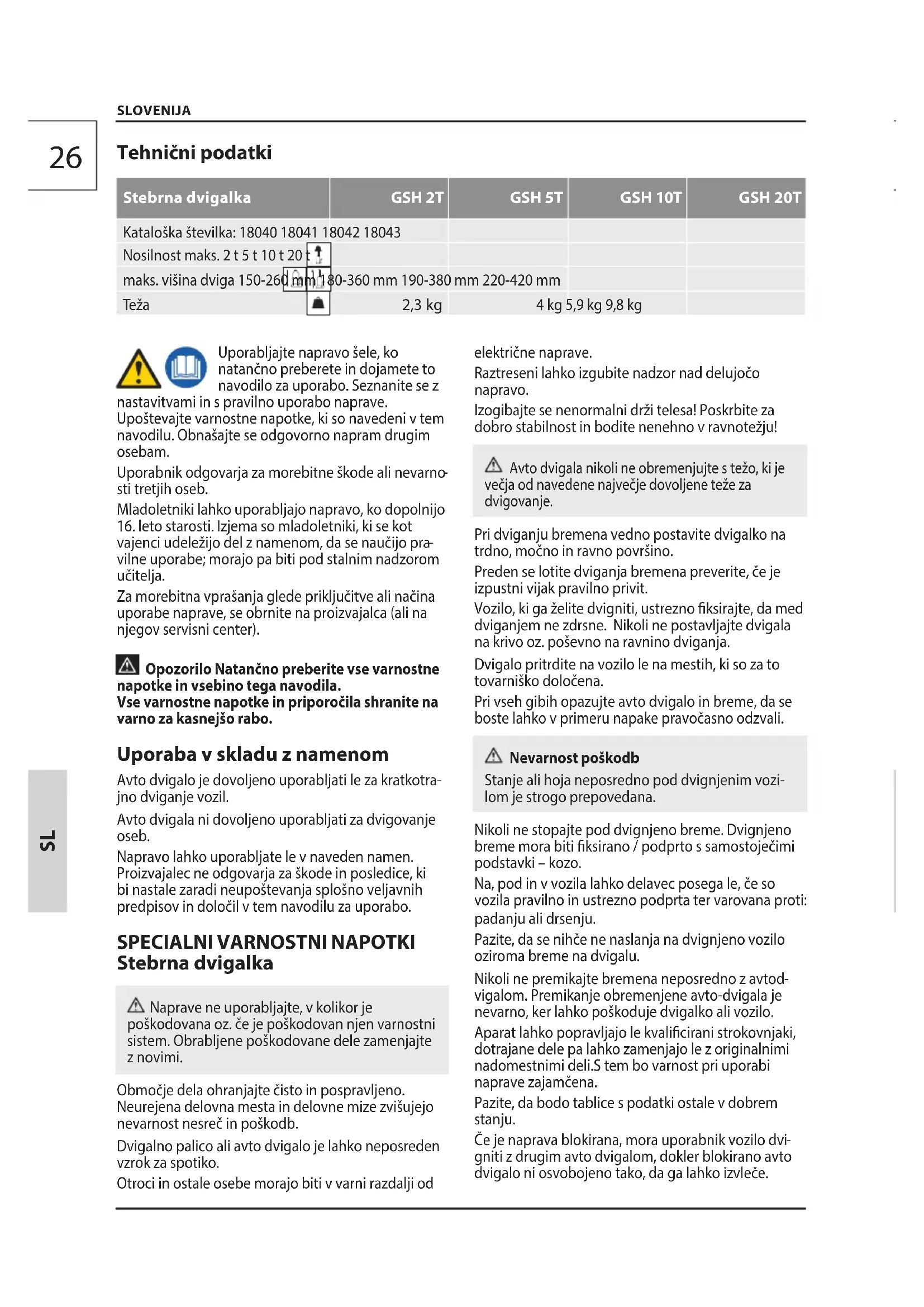 SLOVENIJA Tehnični podatki Stebrna dvigalka GSH 2T GSH 5T GSH 10T GSH 20T Kataloška številka: 18040 18041 18042 18043 Nosilnost maks. 2 t 5 t 10 t 20 t maks. višina dviga 150-260 mm 180-360 mm 190-380 mm 220-420 mm Teža 2,3 kg 4 kg 5,9 kg 9,8 kg Uporabljajte napravo šele, ko natančno preberete in dojamete to navodilo za uporabo. Seznanite se z nastavitvami in s pravilno uporabo naprave. Upoštevajte varnostne napotke, ki so navedeni v tem navodilu. Obnašajte se odgovorno napram drugim osebam. Uporabnik odgovarja za morebitne škode ali nevarno