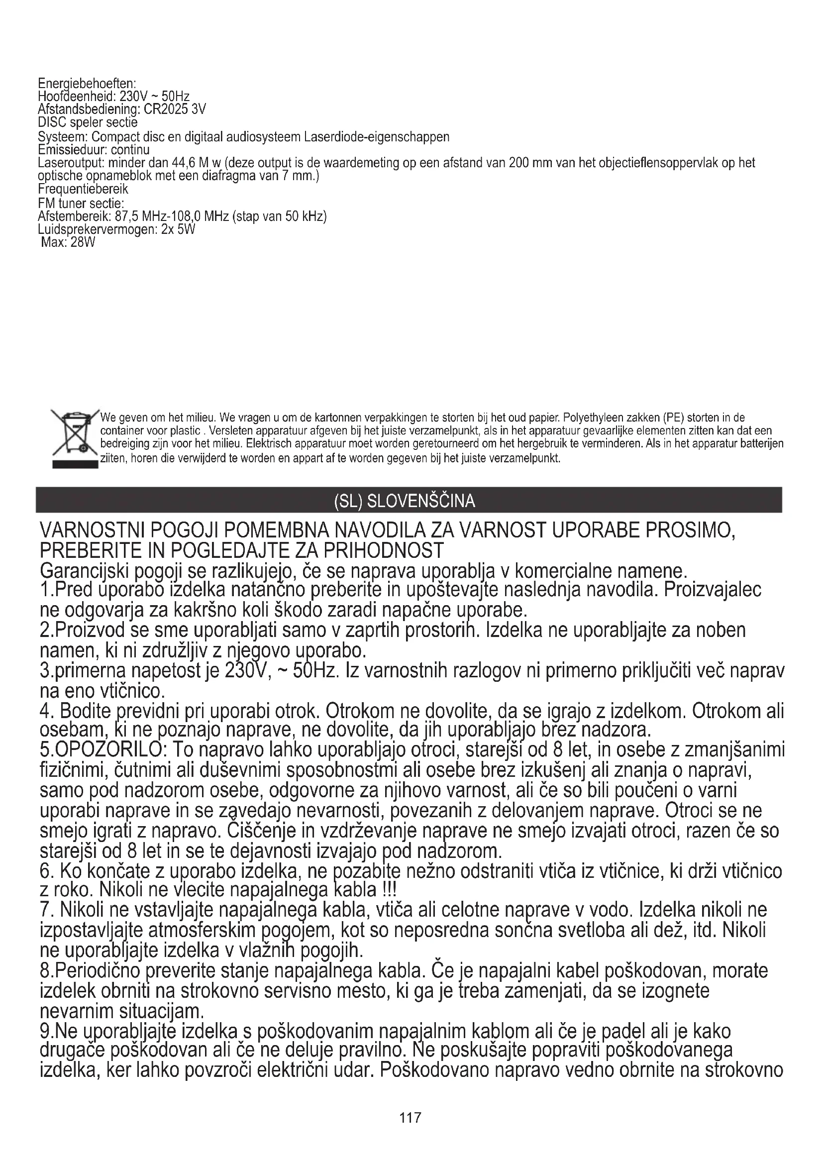 izpostavljajte atmosferskim pogojem, kot so neposredna sončna svetloba ali dež, itd. Nikoli ne uporabljajte izdelka v vlažnih pogojih. 8.Periodično preverite stanje napajalnega kabla. Če je napajalni kabel poškodovan, morate izdelek obrniti na strokovno servisno mesto, ki ga je treba zamenjati, da se izognete nevarnim situacijam. 9.Ne uporabljajte izdelka s poškodovanim napajalnim kablom ali če je padel ali je kako drugače poškodovan ali če ne deluje pravilno. Ne poskušajte popraviti poškodovanega izdelka, ker lahko povzroči električni udar. Poškodovano napravo vedno obrnite na strokovno Energiebehoeften: Hoofdeenheid: 230V ~ 50Hz Afstandsbediening: CR2025 3V DISC speler sectie Systeem: Compact disc en digitaal audiosysteem Laserdiode-eigenschappen Emissieduur: continu Laseroutput: minder dan 44,6 Μ w (deze output is de waardemeting op een afstand van 200 mm van het objectieflensoppervlak op het optische opnameblok met een diafragma van 7 mm.) Frequentiebereik FM tuner sectie: Afstembereik: 87,5 MHz-108,0 MHz (stap van 50 kHz) Luidsprekervermogen: 2x 5W Max: 28W118 servisno mesto, da jo popravite. Vsa popravila lahko opravijo samo pooblaščeni serviserji. Nepravilno izvedeno popravilo lahko povzroči nevarne situacije za uporabnika. 10.Ne postavljajte izdelka na vroče ali tople površine ali v kuhinjske aparate, kot je električna pečica ali plinski gorilnik. 11.Ne uporabljajte izdelka blizu gorljivih snovi. 12.Ne dovolite, da kabel visi nad robom števec ali dotika vročih površin.