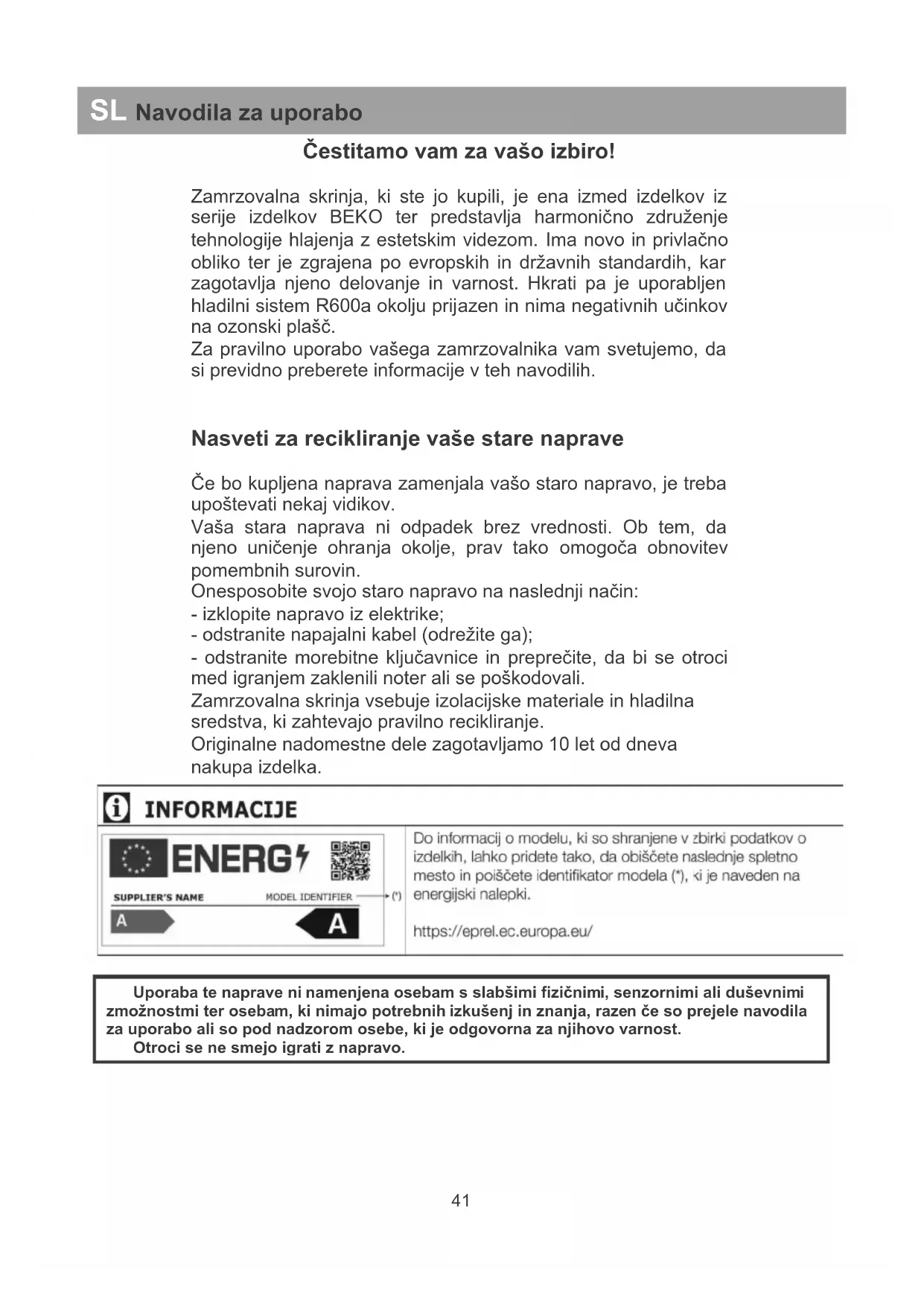 Uporaba te naprave ni namenjena osebam s slabšimi fizičnimi, senzornimi ali duševnimi zmožnostmi ter osebam, ki nimajo potrebnih izkušenj in znanja, razen če so prejele navodila za uporabo ali so pod nadzorom osebe, ki je odgovorna za njihovo varnost.Otroci se ne smejo igrati z napravo. SL Navodila za uporaboRecikliranje embalaže OPOZORILO! Otroci se ne smejo igrati z embalažo ali njenimi deli. Obstaja nevarnost zadušitve z valovito lepenko ali s plastičnim trakom. Da je naprava dostavljena nepoškodovana, jo zavarujemo s primerno embalažo. Vsi materiali embalaže so združljivi z okoljem in primerni za recikliranje. Varujte okolje in nam pomagajte reciklirati embalažo. POMEMBNO! Pred uporabo naprave, previdno in v celoti pre berite ta navodila. Vsebujejo pomembne informacije glede priprave, uporabe in vzdrževanja naprave. Proizvajalec ni odgovoren, če teh navodil ne upoštevate. Hranite navodila na varnem in vidnem mestu, kjer jih lahko čim prej uporabite. Pozneje so lahko uporabna še za drugega uporabnika. POZOR! Napravo lahko uporabljate samo za določene namene (gospodinjska raba) in na primernih območjih, brez dežja, vlage ali drugih vremenskih vplivov. Navodila za prevoz Če se le da, je napravo treba prevažati v navpič nem položaju. Med prevozom mora biti embalaža v brezhibnem stanju. Če je bila naprava med prevozom dana v vodoravni položaj (kot kažejo oznake na embalaži), je priporočljivo, da pred uporabo, počiva 4 ur, da se ponovno nastavi tok hlajenja. Neupoštevanje teh navodil lahko pripelje do okvare motornega kompresorja in preklica njegove garancije. Opozorila in splošni nasveti z Če ste zasledili napako, naprave ne priklapljajte. z Popravila lahko izvede samo usposobljeno osebje. z Izklopite napravo iz napetosti, ko: - popolnoma odtajate napravo; - čistite napravo. Ko izklapljate napravo, povlecite za vtič in ne za kabel. z Zagotovite, da bo med napravo in steno, pred katero stoji, čim manj prostora. z Ne obešajte se na vrata naprave.z Otrokom ne dovolite, da se igrajo z napravo. z Za odtajanje notranjosti zamrzovalnika nikoli ne uporabljate električnih naprav. z Naprave ne uporabljajte v bližini naprav za ogrevanje, kuhalnikov ali drugih virov toplote in ognja. z Zamrzovalnika ne puščajte odprtega dlje kot je treba, ko vanj dajete hrano in jo jemljete ven. z Ne puščajte v napravi hrane, če naprava ne deluje. z V zamrzovalniku ne shranjujte izdelkov, ki vsebujejo vnetljive ali eksplozivne pline. z V zamrzovalniku ne shranjujte pijač z mehurčki (sokovi, mineralna voda, šampanjec itd.) , saj lahko plastenka eksplodira. Ne zamrzujte pijač v plastenkah. z Kock ledu ali sladoleda ne jejte takoj po tem, ko jih vzamete iz zamrzovalnika, saj lahko povzročijo ozebline. z Z mokrimi rokami se nikoli ne dotikajte kovinskih delov ali zamrznjene hrane, saj lahko vaše roke hitro zamrznejo na zelo mrzli površini. z Med skladiščenjem in prevozom naprave poskrbite za njeno varnost in uporabite distančnike med vrati in predalnikom (na sprednji in zadnji strani). Pred uporabo distančnike odstranite.