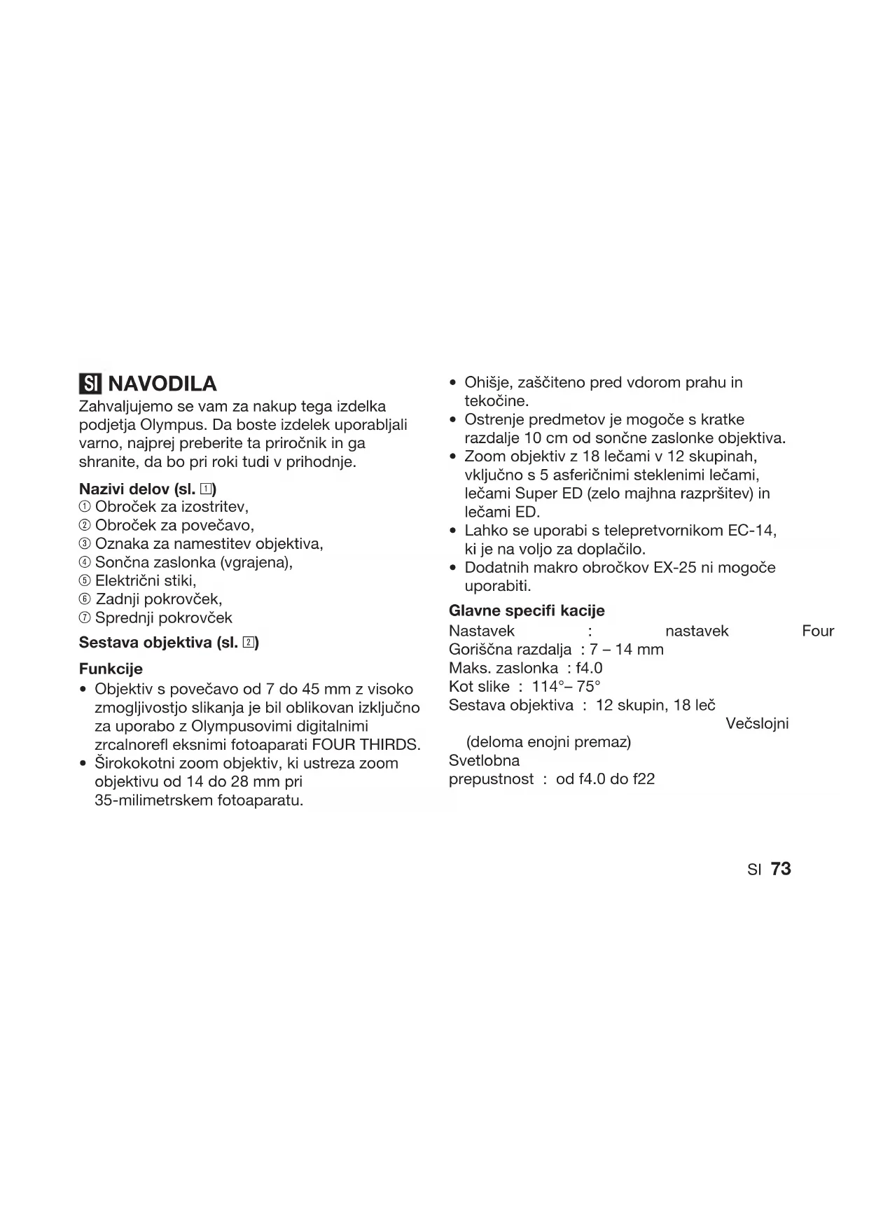 - SI 73 NAVODILA Zahvaljujemo se vam za nakup tega izdelka podjetja Olympus. Da boste izdelek uporabljali varno, najprej preberite ta priročnik in ga shranite, da bo pri roki tudi v prihodnje. Nazivi delov (sl. 1) 1 Obroček za izostritev, 2 Obroček za povečavo, 3 Oznaka za namestitev objektiva, 4 Sončna zaslonka (vgrajena), 5 Električni stiki, 6 Zadnji pokrovček, 7 Sprednji pokrovček Sestava objektiva (sl. 2) Funkcije Objektiv s povečavo od 7 do 45 mm z visoko zmogljivostjo slikanja je bil oblikovan izključno za uporabo z Olympusovimi digitalnimi zrcalnorefl eksnimi fotoaparati FOUR THIRDS. Širokokotni zoom objektiv, ki ustreza zoom objektivu od 14 do 28 mm pri 35-milimetrskem fotoaparatu.