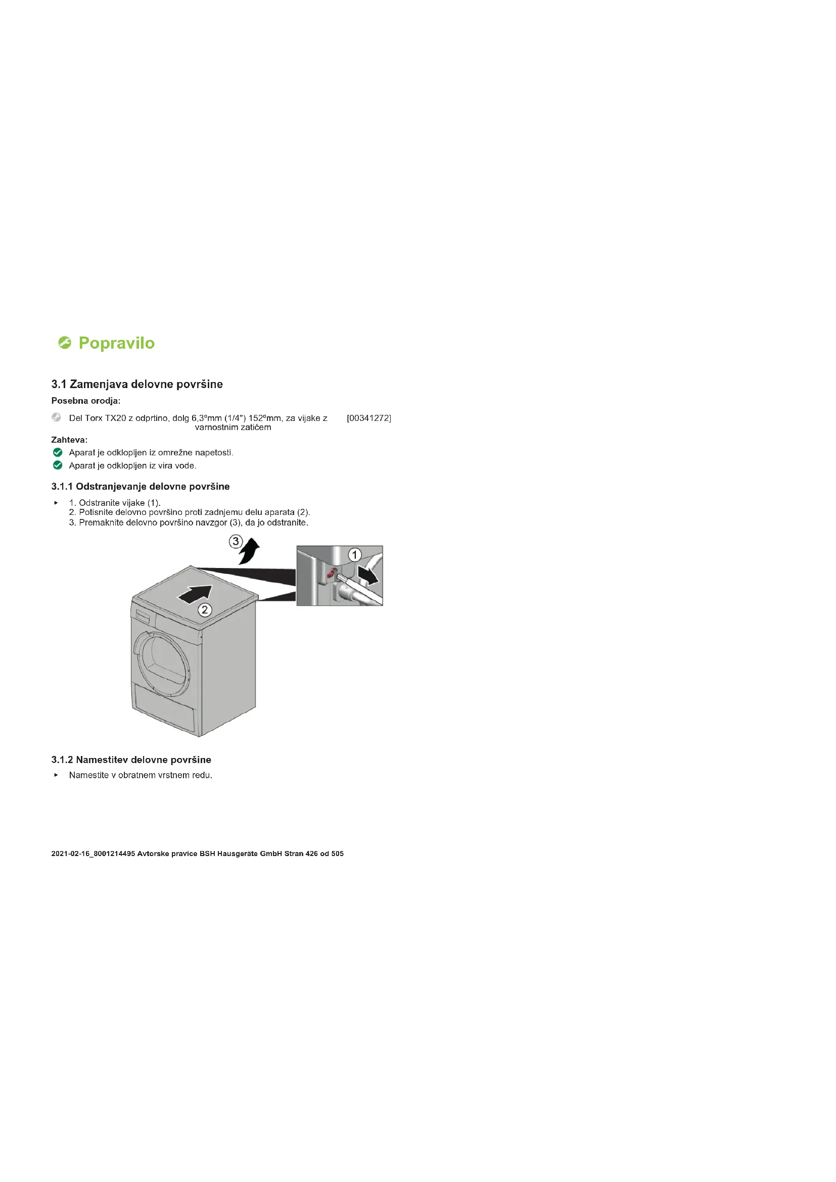 Popravilo 2021-02-16_8001214495 Avtorske pravice BSH Hausgeräte GmbH Stran434od50512. Sprostite vijake na vrhu sprednje plošče (3).