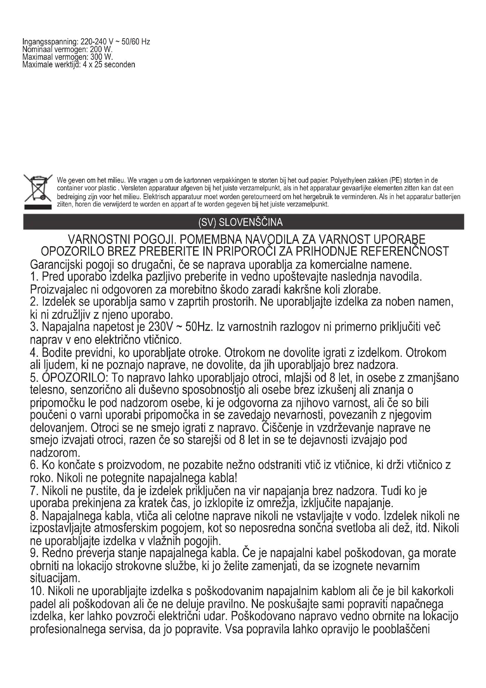 Opis težave: Skupno delovanje je 5 ciklov in se samodejno izklopi, da zaščiti enoto Rešitev težave: Odklopite napajalni kabel, počakajte, da se ohladi, nato znova zaženite. ALI Opis težave: Motor se pregreva. Rešitev težave: Čakanje na ohladitev motorja čez 30 minut in ponovni zagon. Tehnični podatki: Vhodna napetost: 220-240 V ~ 50/60 Hz Nazivna moč: 200 W Največja moč: 300 Wviše uređaja na jednu utičnicu.