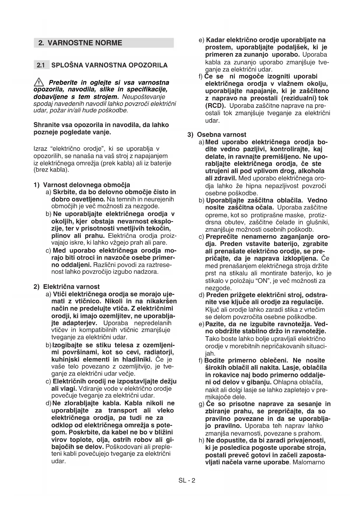 a) Med uporabo električnega orodja bo- dite vedno pazljivi, kontrolirajte, kaj delate, in ravnajte premišljeno. Ne upo- rabljajte električnega orodja, če ste utrujeni ali pod vplivom drog, alkohola ali zdravil. Med uporabo električnega oro- dja lahko že hipna nepazljivost povzroči osebne poškodbe. b) Uporabljajte zaščitna oblačila. Vedno nosite zaščitna očala. Uporaba zaščitne opreme, kot so protiprašne maske, protiz- drsna obutev, zaščitne čelade in glušniki, zmanjšuje možnosti osebnih poškodb. c) Preprečite nenamerno zaganjanje oro- dja. Preden vstavite baterijo, zgrabite ali prenašate električno orodje, se pre- pričajte, da je naprava izklopljena. Če med prenašanjem električnega stroja držite prst na stikalu ali montirate baterijo, ko je stikalo v položaju “ON”, je več možnosti za nezgode. d) Preden prižgete električni stroj, odstra- nite vse ključe ali orodje za regulacije. Ključ ali orodje lahko zaradi stika z vrtečim se delom povzročita osebne poškodbe. e) Pazite, da ne izgubite ravnotežja. Ved- no obdržite stabilno držo in ravnotežje. Tako boste lahko bolje upravljali električno orodje v morebitnih nepričakovanih situaci- jah. f) Bodite primerno oblečeni. Ne nosite širokih oblačil ali nakita. Lasje, oblačila in rokavice naj bodo primerno oddalje- ni od delov v gibanju. Ohlapna oblačila, nakit ali dolgi lasje se lahko zapletejo v pre- mikajoče dele. g) Če so prisotne naprave za sesanje in zbiranje prahu, se prepričajte, da so pravilno povezane in da se uporablja- jo pravilno. Uporaba teh naprav lahko zmanjša nevarnosti, povezane s prahom. h) Ne dopustite, da bi zaradi privajenosti, ki je posledica pogoste uporabe stroja, postali preveč gotovi in začeli zaposta- vljati načela varne uporabe. MalomarnoSL - 3 dejanje lahko v delčku sekunde privede do hudih poškodb.