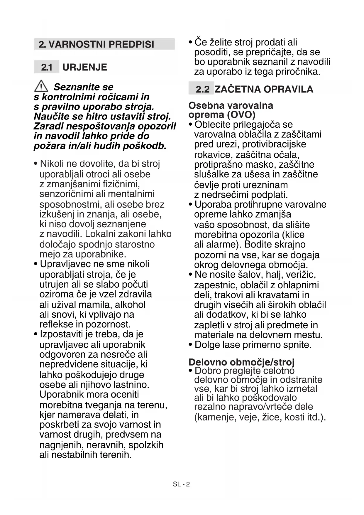 - Dobro preglejte celotno delovno območje in odstranite vse, kar bi stroj lahko izmetal ali bi lahko poškodovalo rezalno napravo/vrteče dele (kamenje, veje, žice, kosti itd.).SL - 3
