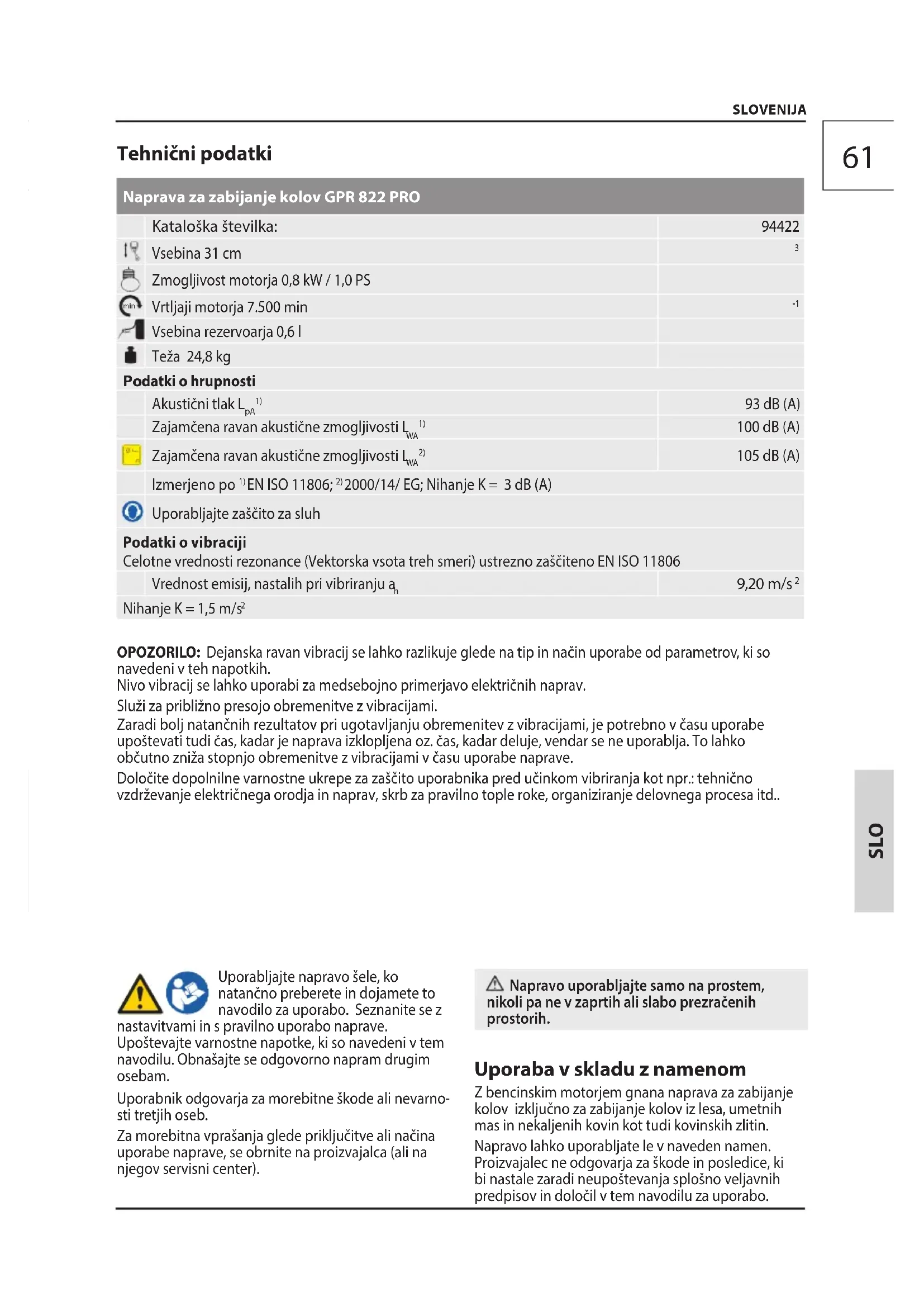 sti tretjih oseb. Za morebitna vprašanja glede priključitve ali načina uporabe naprave, se obrnite na proizvajalca (ali na njegov servisni center). Napravo uporabljajte samo na prostem, nikoli pa ne v zaprtih ali slabo prezračenih prostorih. Uporaba v skladu z namenom Z bencinskim motorjem gnana naprava za zabijanje kolov izključno za zabijanje kolov iz lesa, umetnih mas in nekaljenih kovin kot tudi kovinskih zlitin. Napravo lahko uporabljate le vnaveden namen. Proizvajalec ne odgovarja za škode in posledice, ki bi nastale zaradi neupoštevanja splošno veljavnih predpisov in določil v tem navodilu za uporabo. SLO62 SLO SLOVENIJA Obvezno upoštevajte predpise, ki veljajo v državi, kjer se naprava uporablja. Zahteve, ki jih mora spolnjevati uporabnik Napravo lahko uporabljajo in vzdržujejo le osebe, ki jo dobro poznajo in so seznanjene z možnimi nevarnostmi. Nikoli ne puščajte otrok, da napravo uporabljajo sami. Nikoli ne puščajte odraslih oseb brez tega, da jih naučite pravilno uporabljati napravo. Uporabnik je pred uporabo naprave dolžan natančno prebrati navodilo za uporabo. Izobrazba: Za uporabo ni potrebna nobe