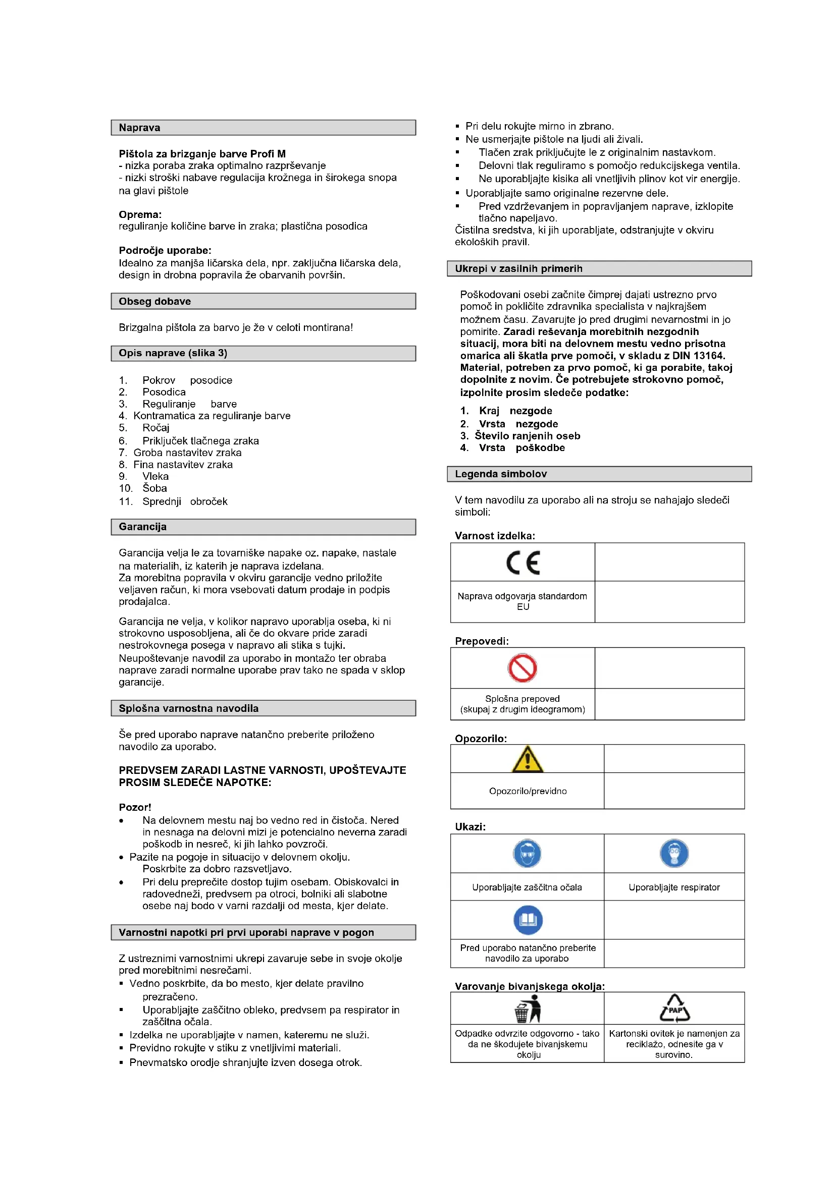 • Pri delu preprečite dostop tujim osebam. Obiskovalci in radovedneži, predvsem pa otroci, bolniki ali slabotne osebe naj bodo v varni razdalji od mesta, kjer delate. Varnostni napotki pri prvi uporabi naprave v pogon Z ustreznimi varnostnimi ukrepi zavaruje sebe in svoje okolje pred morebitnimi nesrečami. Vedno poskrbite, da bo mesto, kjer delate pravilno prezračeno. Uporabljajte zaščitno obleko, predvsem pa respirator in zaščitna očala. Izdelka ne uporabljajte v namen, kateremu ne služi. Previdno rokujte v stiku z vnetljivimi materiali. Pnevmatsko orodje shranjujte izven dosega otrok. Pri delu rokujte mirno in zbrano. Ne usmerjajte pištole na ljudi ali živali. Tlačen zrak priključujte le z originalnim nastavkom. Delovni tlak reguliramo s pomočjo redukcijskega ventila. Ne uporabljajte kisika ali vnetljivih plinov kot vir energije. Uporabljajte samo originalne rezervne dele. Pred vzdrževanjem in popravljanjem naprave, izklopite tlačno napeljavo. Čistilna sredstva, ki jih uporabljate, odstranjujte v okviru ekoloških pravil. Ukrepi v zasilnih primerih Poškodovani osebi začnite čimprej dajati ustrezno prvo pomoč in pokličite zdravnika specialista v najkrajšem možnem času. Zavarujte jo pred drugimi nevarnostmi in jo pomirite. Zaradi reševanja morebitnih nezgodnih situacij, mora biti na delovnem mestu vedno prisotna omarica ali škatla prve pomoči, v skladu z DIN 13164. Material, potreben za prvo pomoč, ki ga porabite, takoj dopolnite z novim. Če potrebujete strokovno pomoč, izpolnite prosim sledeče podatke: